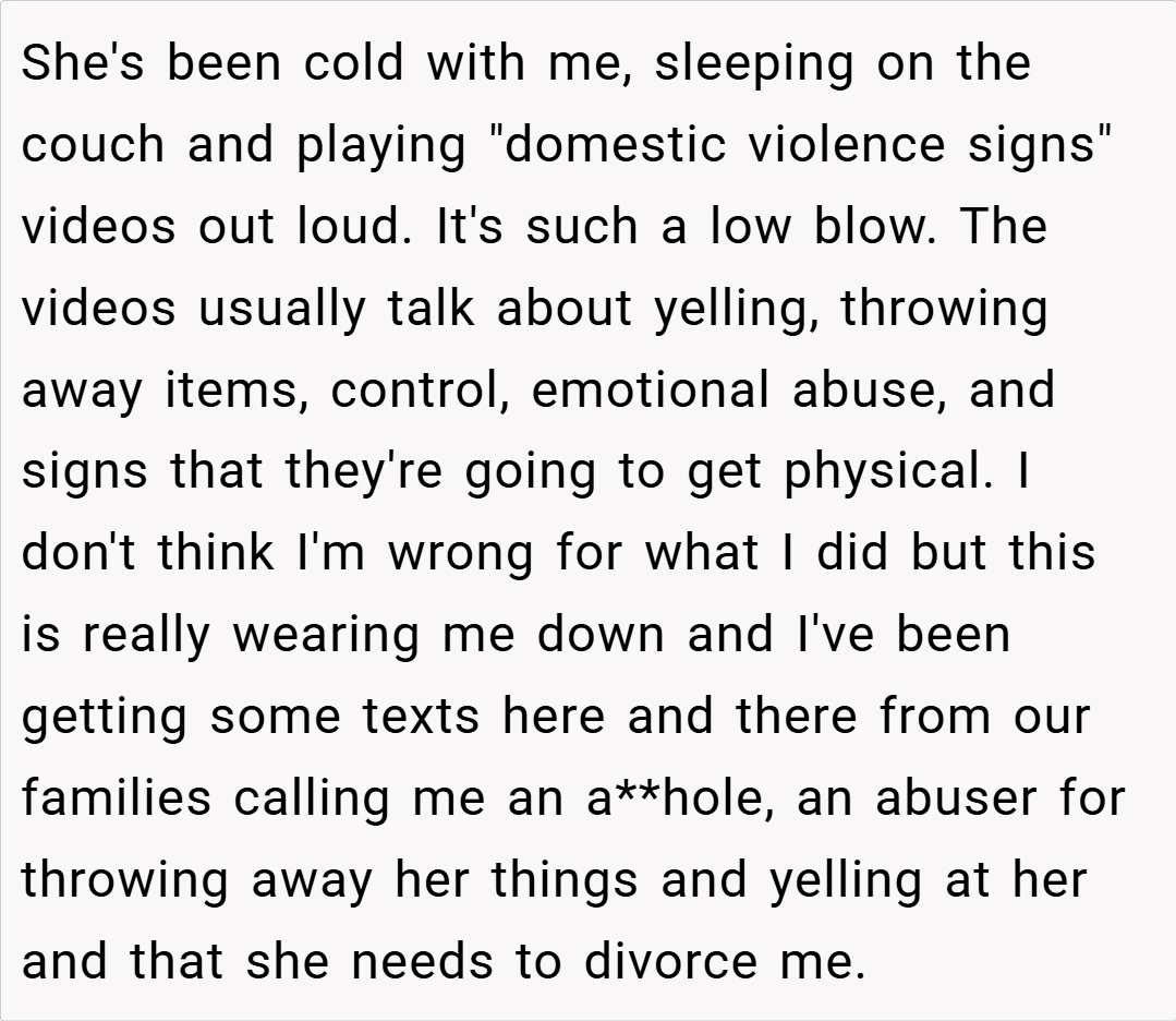 disposable dishes and clothes out of the house. Although he later apologized, his wife now claims she feels unsafe around him, and family members have called him an abuser. This incident has left him wondering: Am I the asshole for reacting so strongly after months of feeling unappreciated and taken for granted?