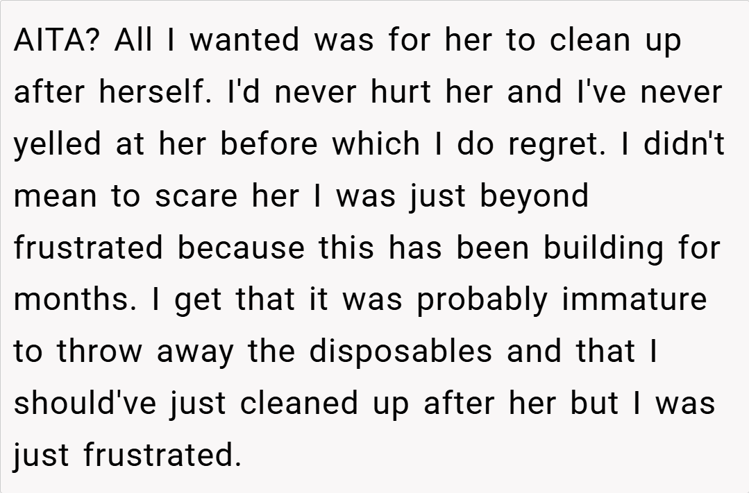 In this scenario, the OP’s decision to toss away disposable items and raise his voice was a spontaneous reaction to months of building resentment. Although it may not have been the most tactful approach, it reflects a deep-seated need for balance and accountability within the household.