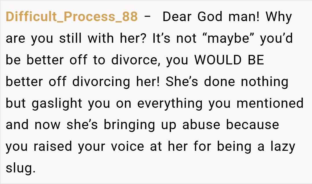 His wife, who despises washing dishes and neglects to put her clothes in their proper place, began to push him to his limit. After witnessing her repeatedly avoid doing her share—occasionally faking tears to get out of the task—he finally lost his cool. In a moment of sheer frustration, he raised his voice and even began tossing her cheaply bought,