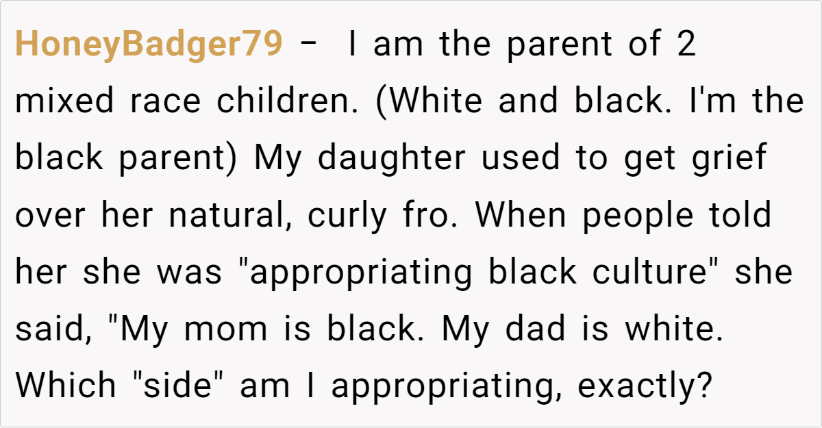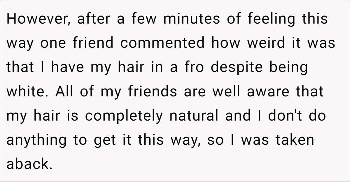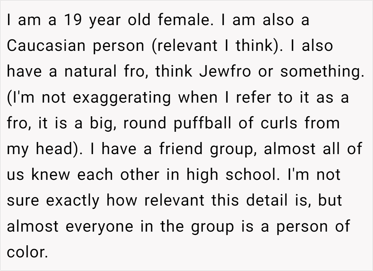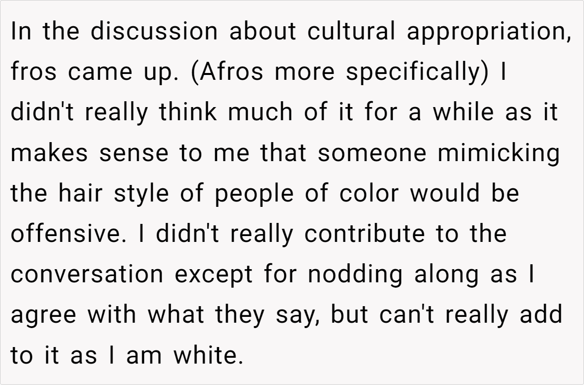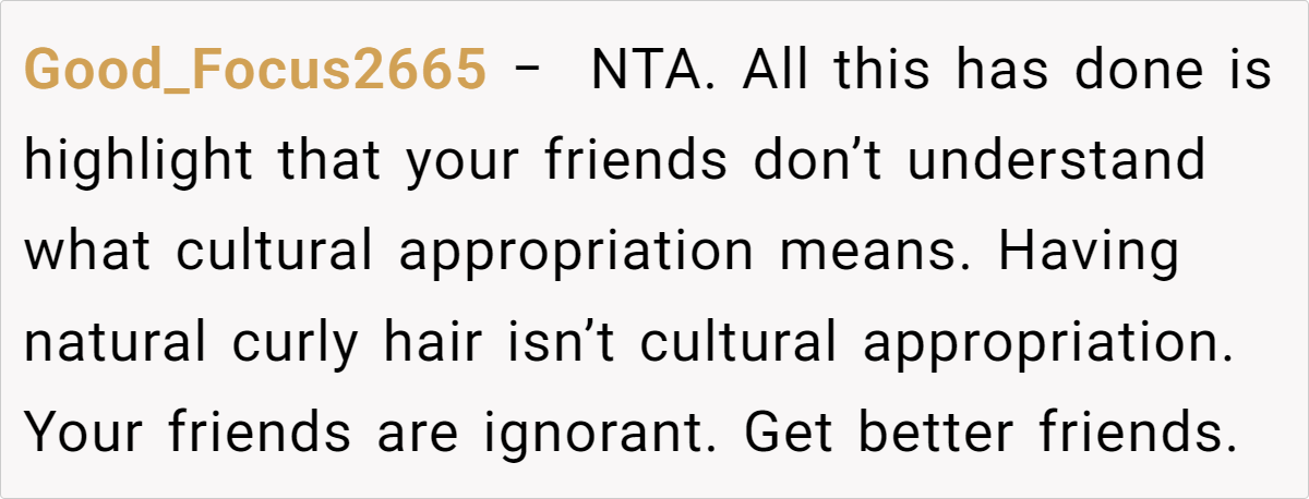 This story highlights the nuances of such conversations and the potential for misunderstandings, even within close-knit groups. The Reddit post below describes an interaction where a young woman with naturally curly hair is accused of cultural appropriation by her friends, who are mostly people of color.