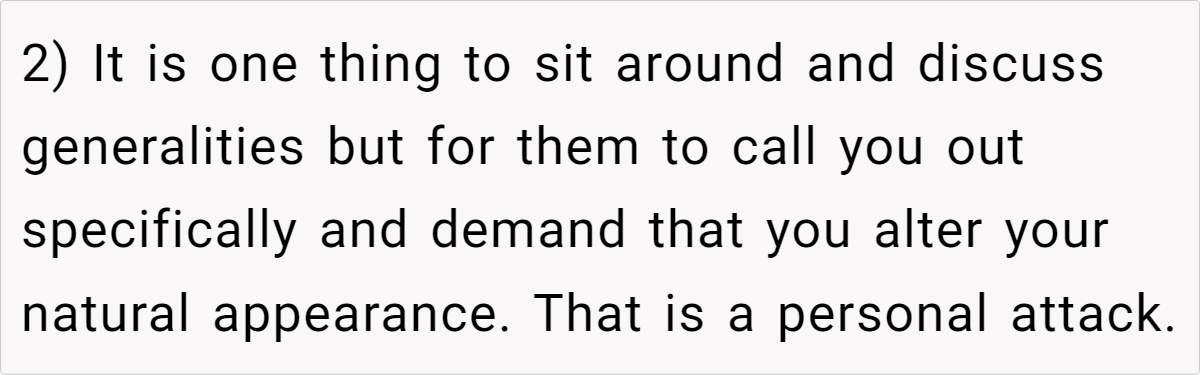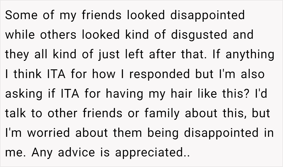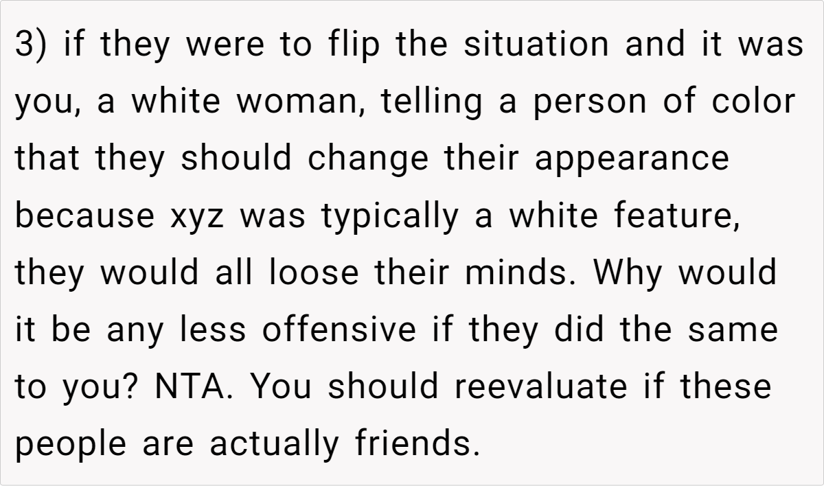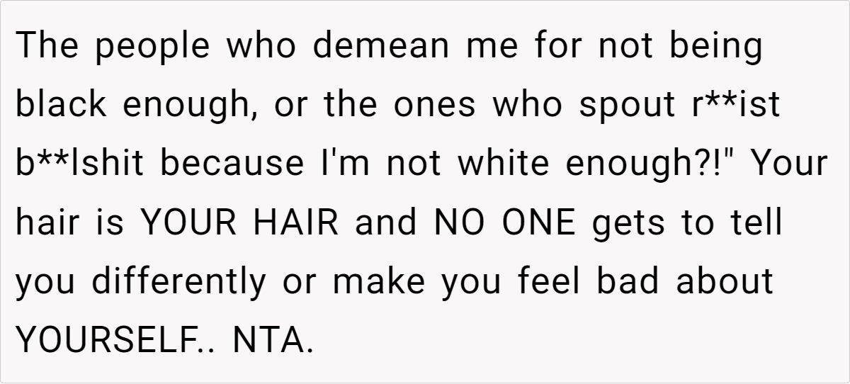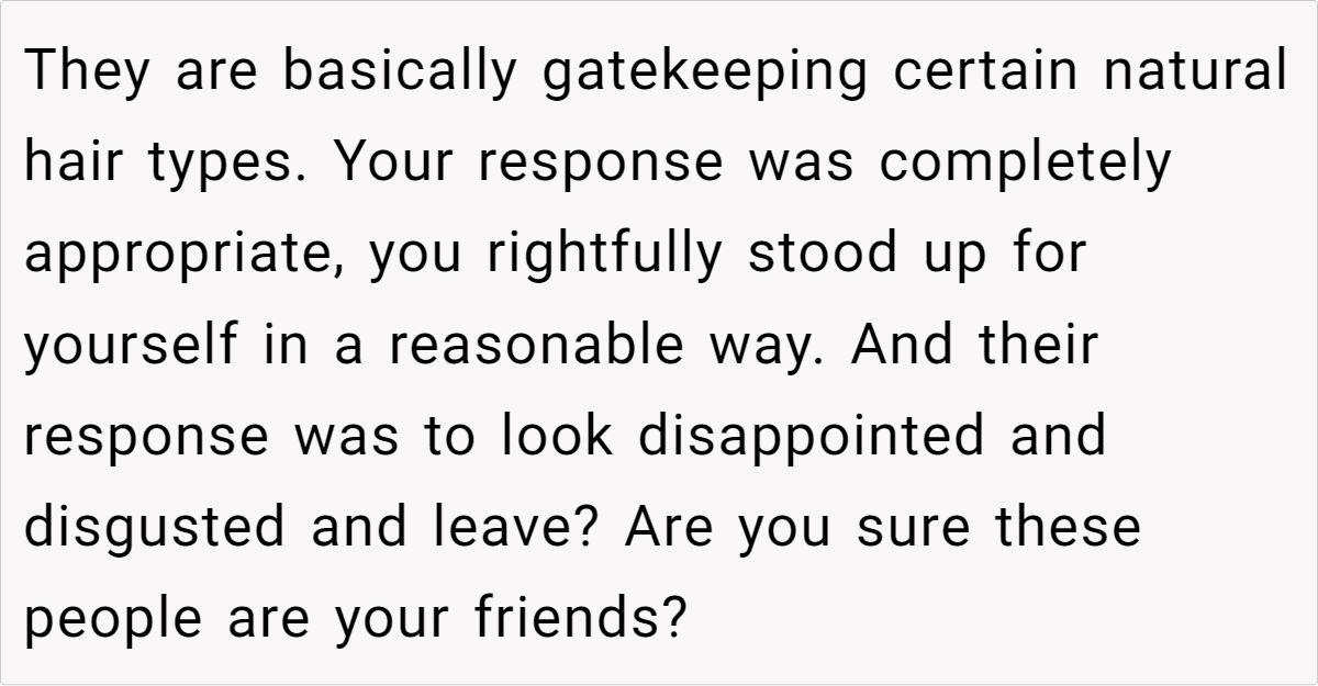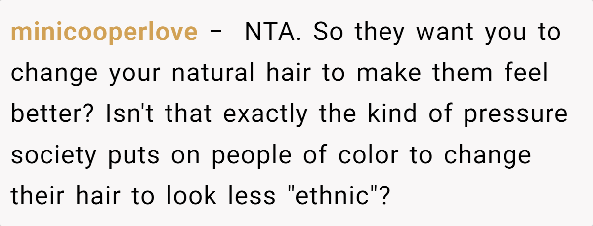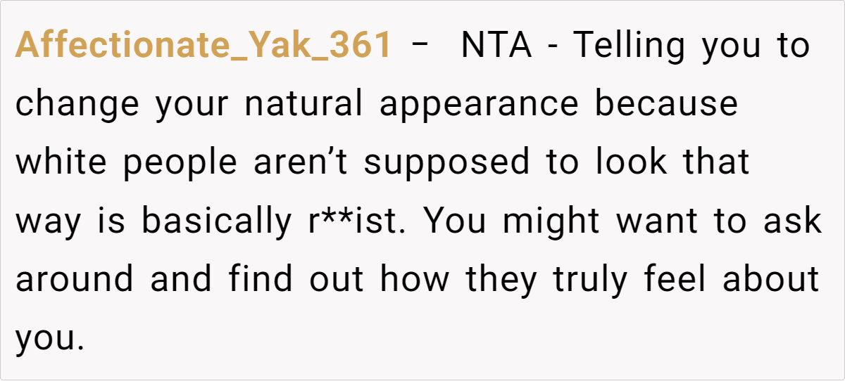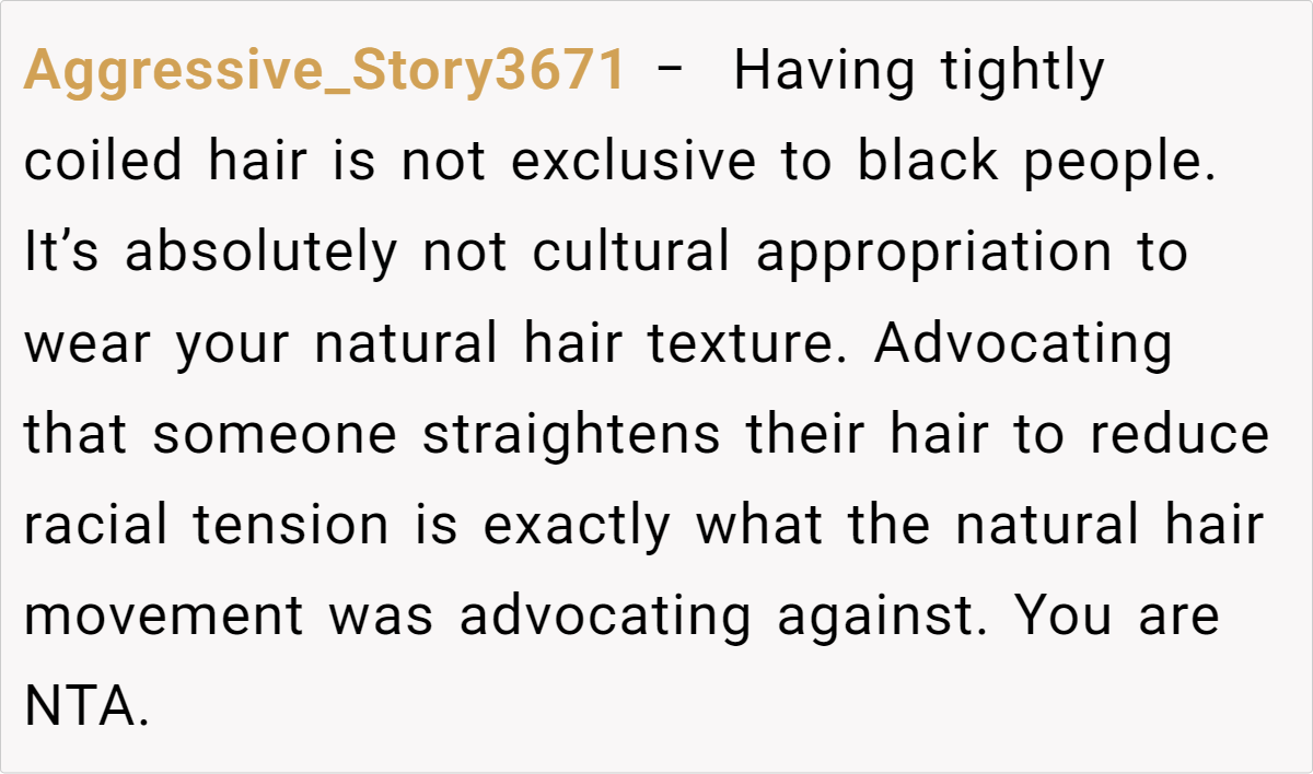 The comments overwhelmingly support the young woman, criticizing her friends’ accusations and defending her right to wear her natural hair. Many commenters point out the hypocrisy of demanding that she change her hair while advocating for natural hair acceptance for people of color. The young woman is seen as NTA (Not The Asshole), with many suggesting that her friends’ comments were insensitive and misguided.