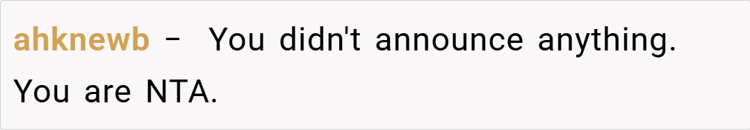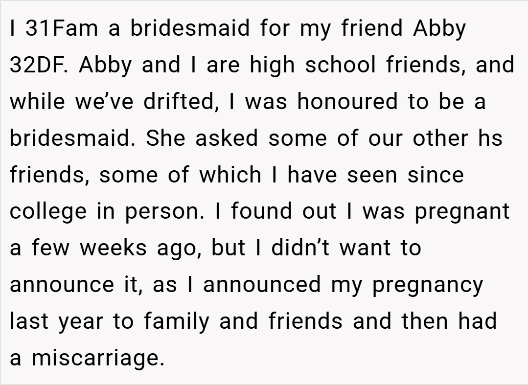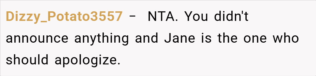 What was meant to be a lighthearted gathering turned sour as the secret was blurted out for all to hear. Despite her initial attempts to deflect and keep the news private until she was ready, the accidental announcement left her feeling exposed on a day that was supposed to celebrate Abby’s upcoming nuptials. Now, with emotions running high, she’s left wondering if her reaction—and the ensuing fallout—makes her the a**hole.