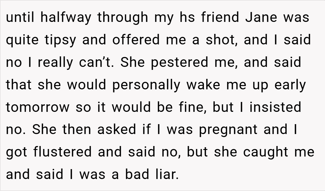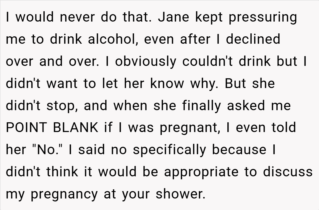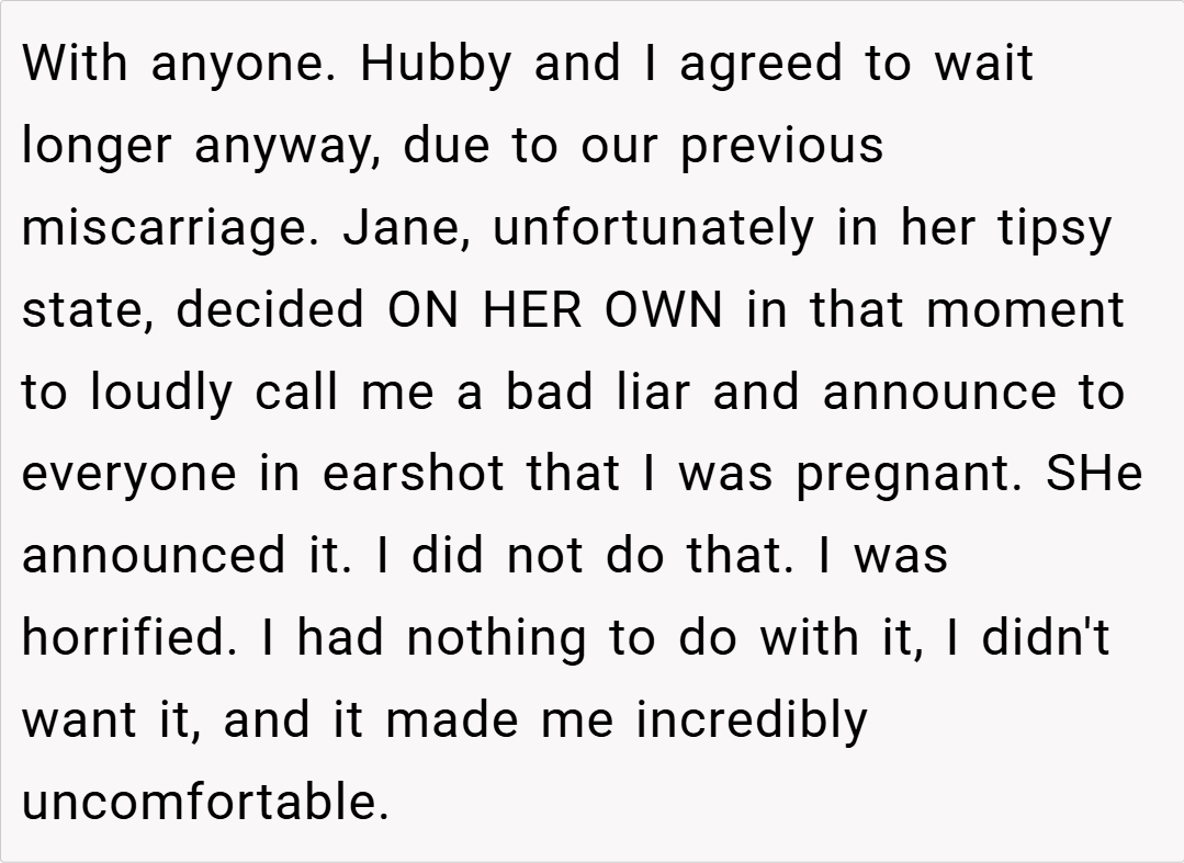 the storyteller’s intention was to keep her pregnancy private until she felt ready to share it—given the painful history of a previous miscarriage—so as to protect her emotional well-being. However, when Jane, fueled by tipsy enthusiasm, cornered her with direct questions, the moment escalated beyond control. This situation highlights how personal disclosures, particularly about sensitive topics like pregnancy, require a carefully chosen time and setting.