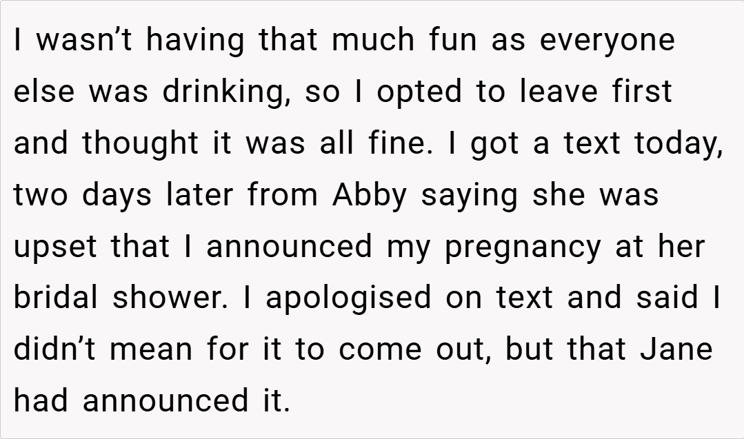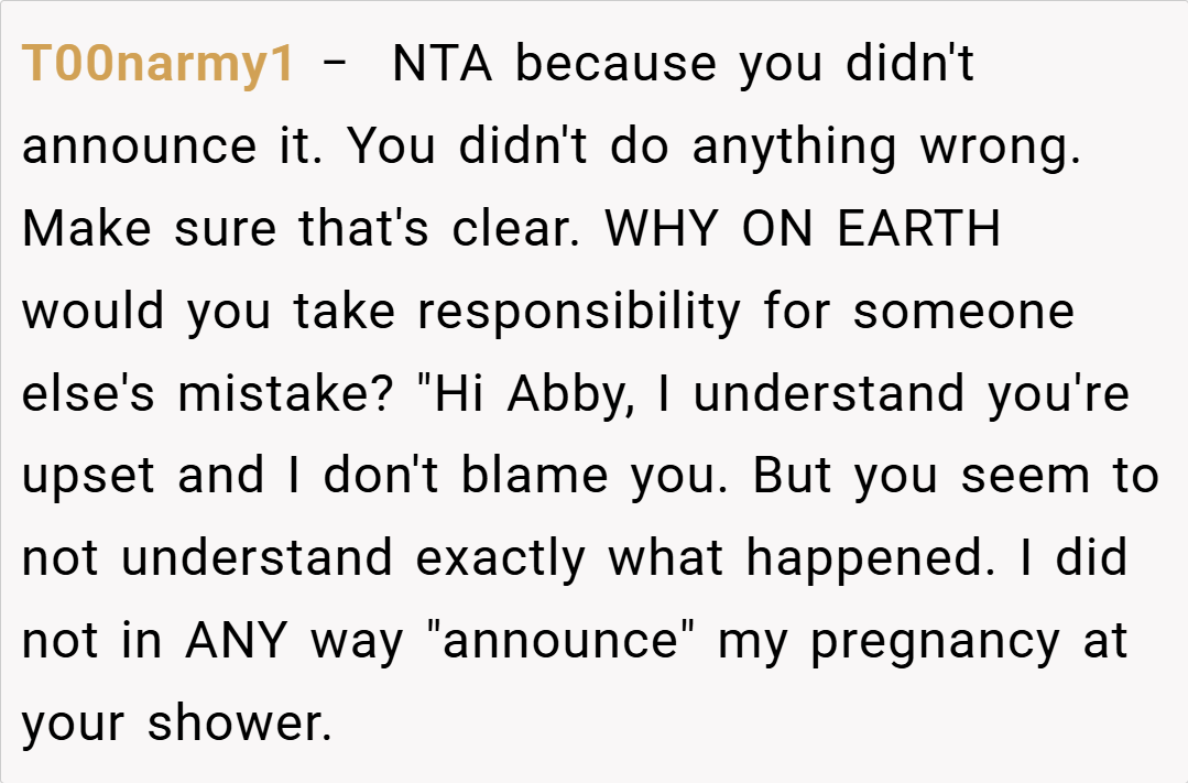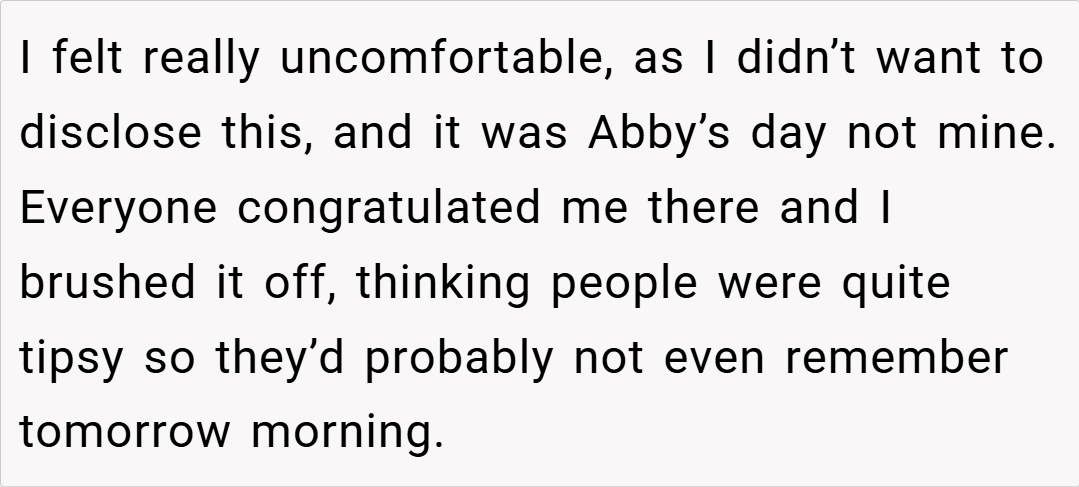 Furthermore, the dynamics at play here go beyond the mere act of announcing a pregnancy. They touch on the respect one expects at events that are not primarily about them. The bridal shower was meant to celebrate Abby’s upcoming wedding, and any deviation from that focus can feel like an intrusion. When personal news is forced into the spotlight against one’s wishes, it can lead to feelings of violation and embarrassment.
