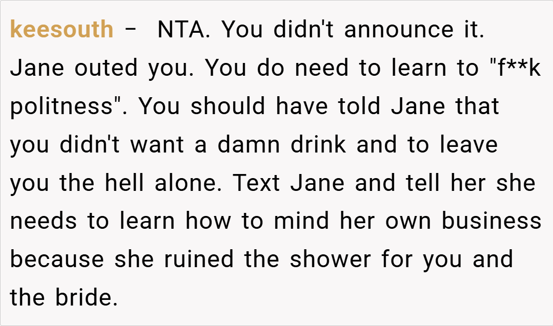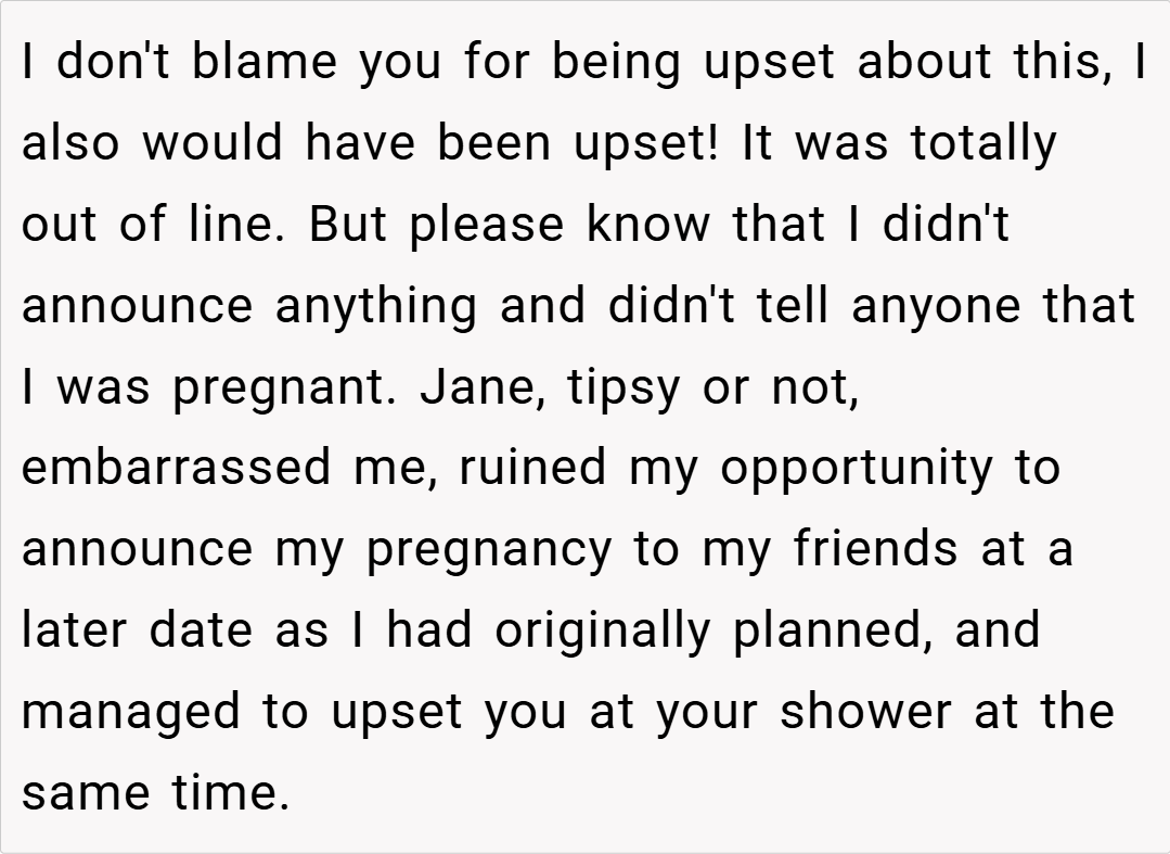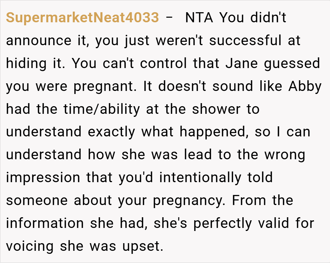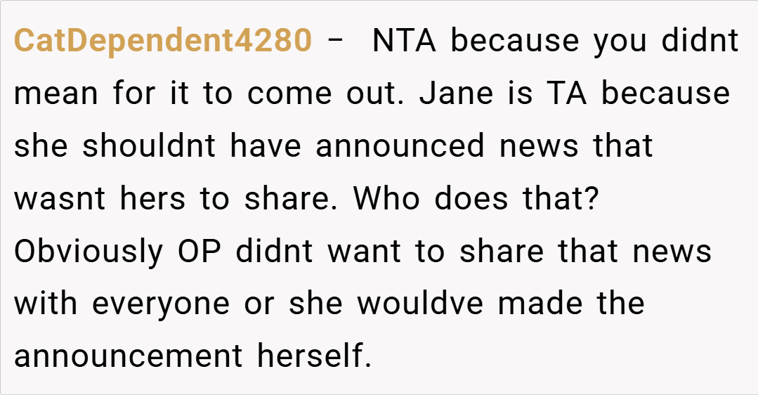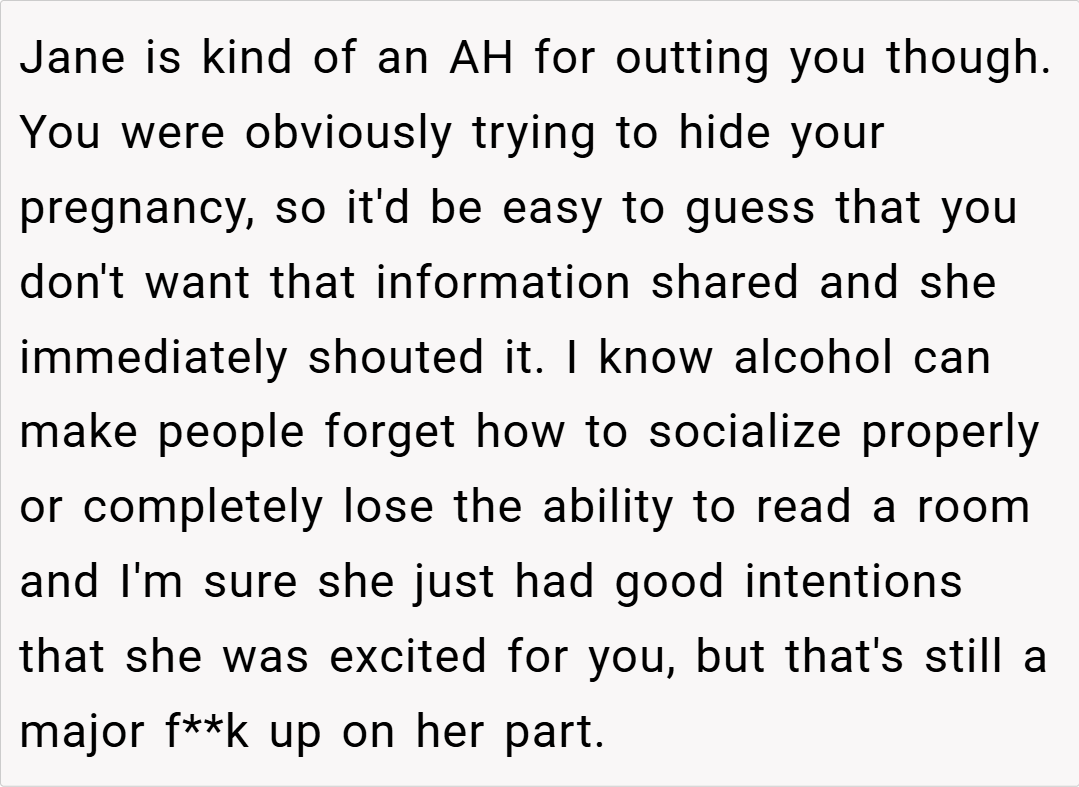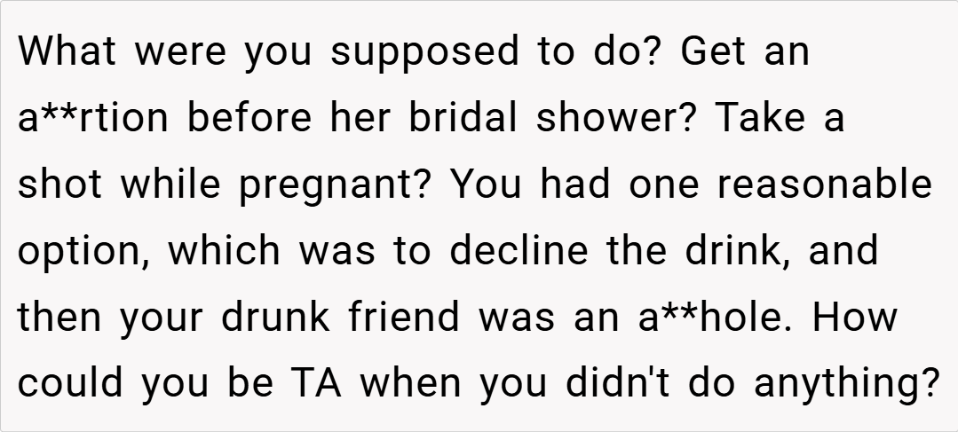 Many redditors sympathize with her need for privacy and appreciate that the announcement was not her intention but rather an unplanned moment fueled by alcohol. Others feel that in a social setting like a bridal shower, surprises happen, and perhaps she should have been prepared for a slip-up. The community remains divided on whether her reaction was justified or if she should have handled it differently in the aftermath.