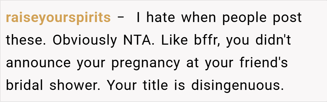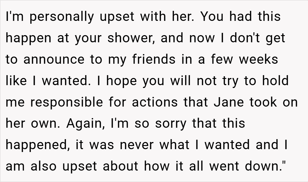 In conclusion, this story reminds us that timing and context are everything when it comes to sharing personal news. The accidental reveal of a pregnancy at a bridal shower—an event dedicated to celebrating another’s joy—can lead to mixed feelings and unintended consequences. Was it truly wrong to have the news blurted out by someone else,