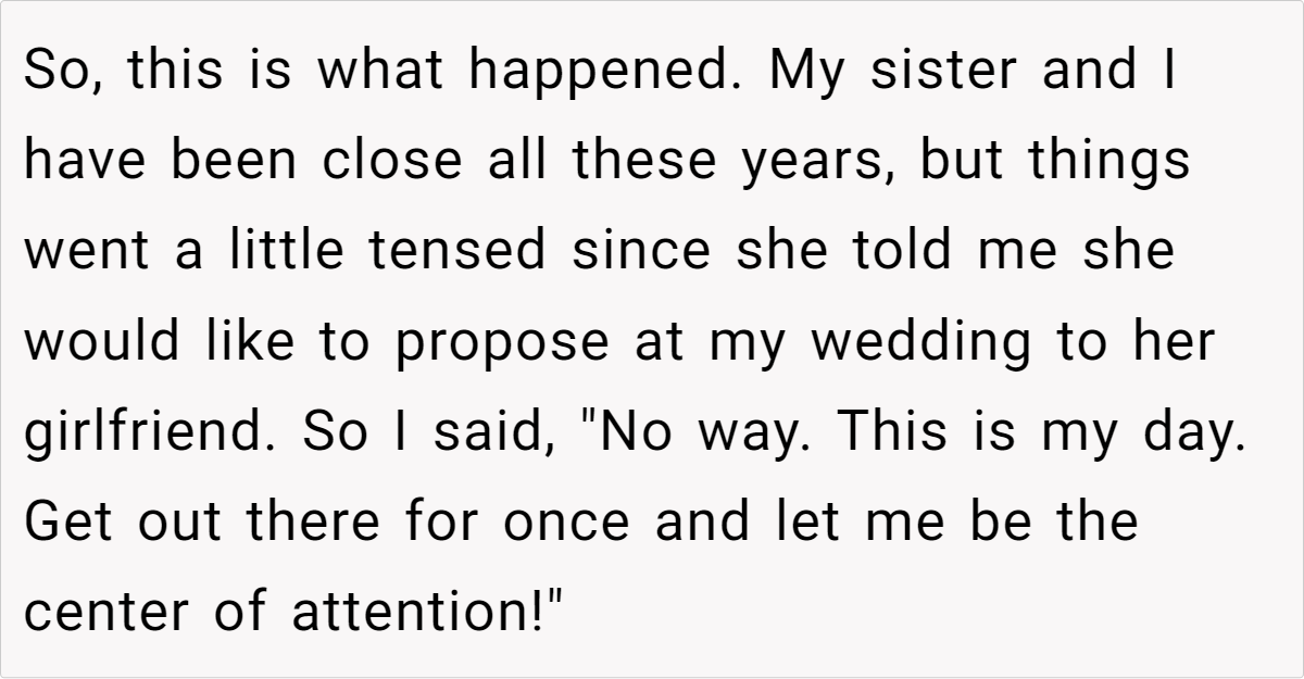 A woman decided to announce her pregnancy during her sister’s wedding reception, feeling justified since her sister had proposed to her girlfriend during the woman’s wedding against her explicit wishes. While she believed it was a fair reaction and an opportunity to share her joy with family,