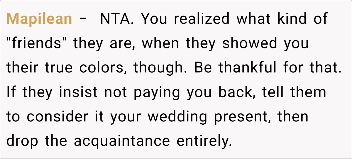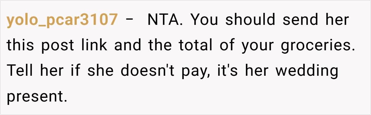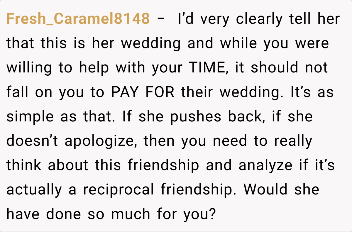 The Reddit community overwhelmingly supports OP, arguing that it’s unfair for her to bear the food costs for the wedding. Many commenters emphasize that OP played a crucial role in ensuring the event’s success, yet she ended up being financially taken advantage of. Several voices advise her to demand proper reimbursement or to reconsider her friendship with people who fail to appreciate her contributions. Overall, the consensus is clear: OP is not at fault, and this situation reflects an unhealthy dynamic in her friendships.