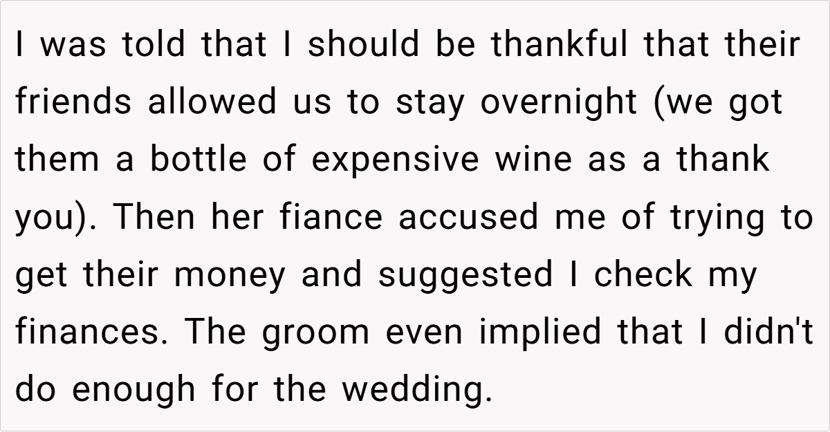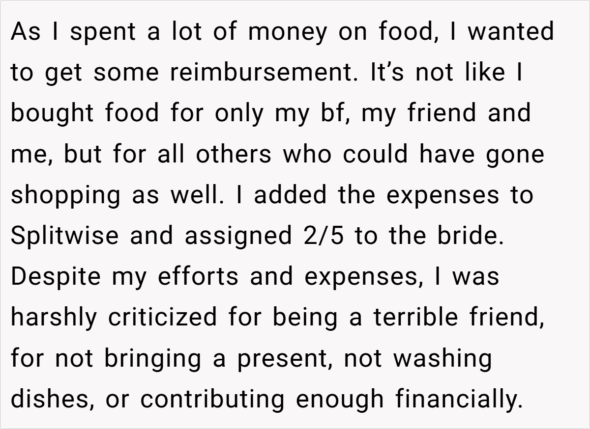 In many modern celebrations, informal arrangements like splitting costs via apps such as Splitwise are common, but they only work when all parties agree in advance. The witness’s decision to itemize her expenses and seek reimbursement was a reasonable step toward fairness, especially when the couple explicitly requested no gifts. Instead, her gesture of goodwill turned into a trigger for criticism, as friends and even the couple’s family members questioned her loyalty and generosity.