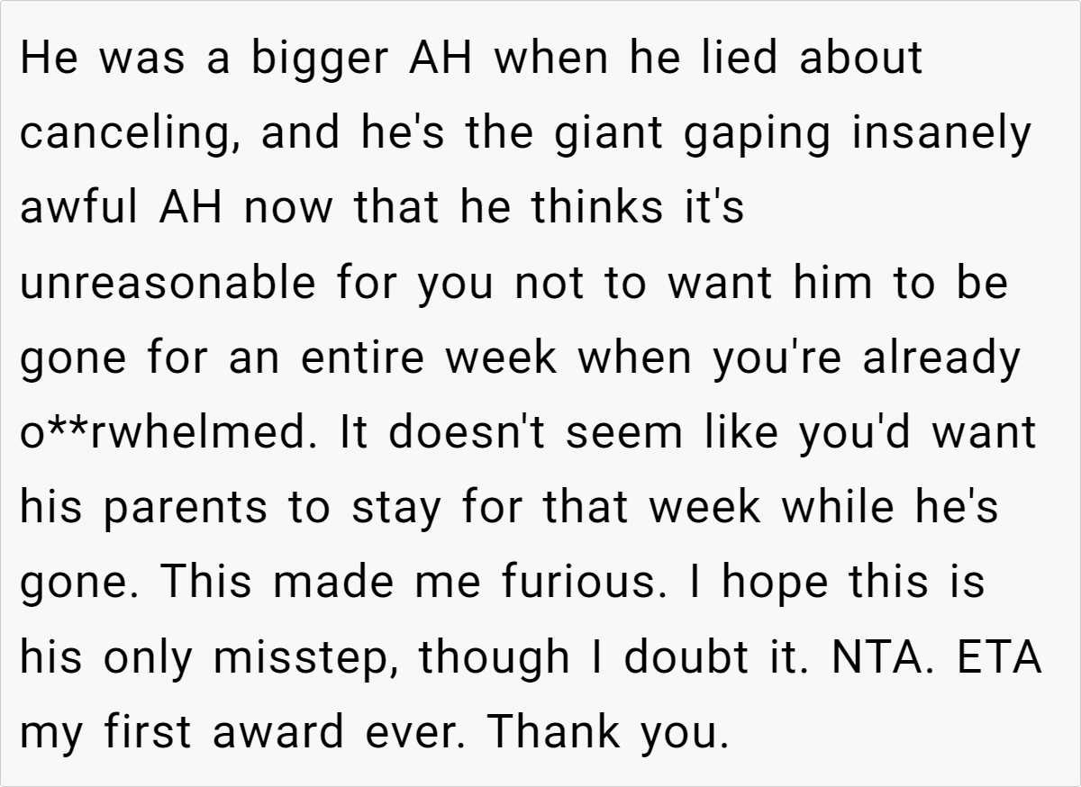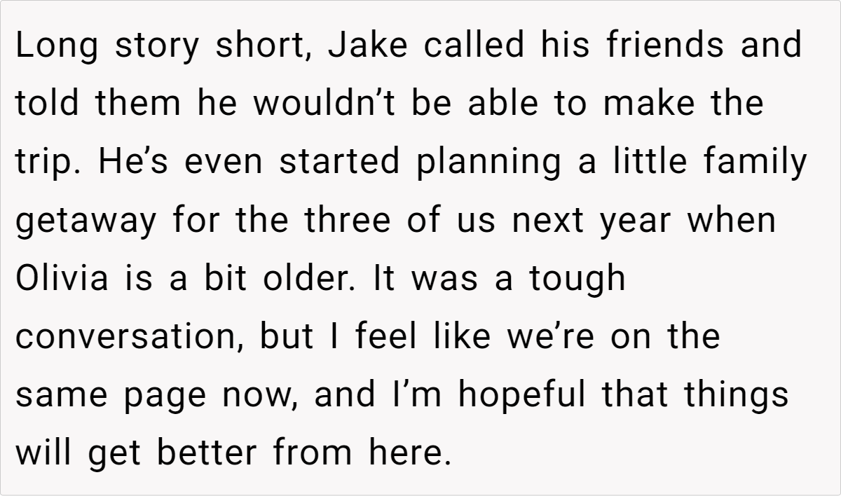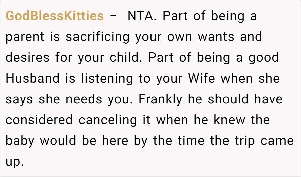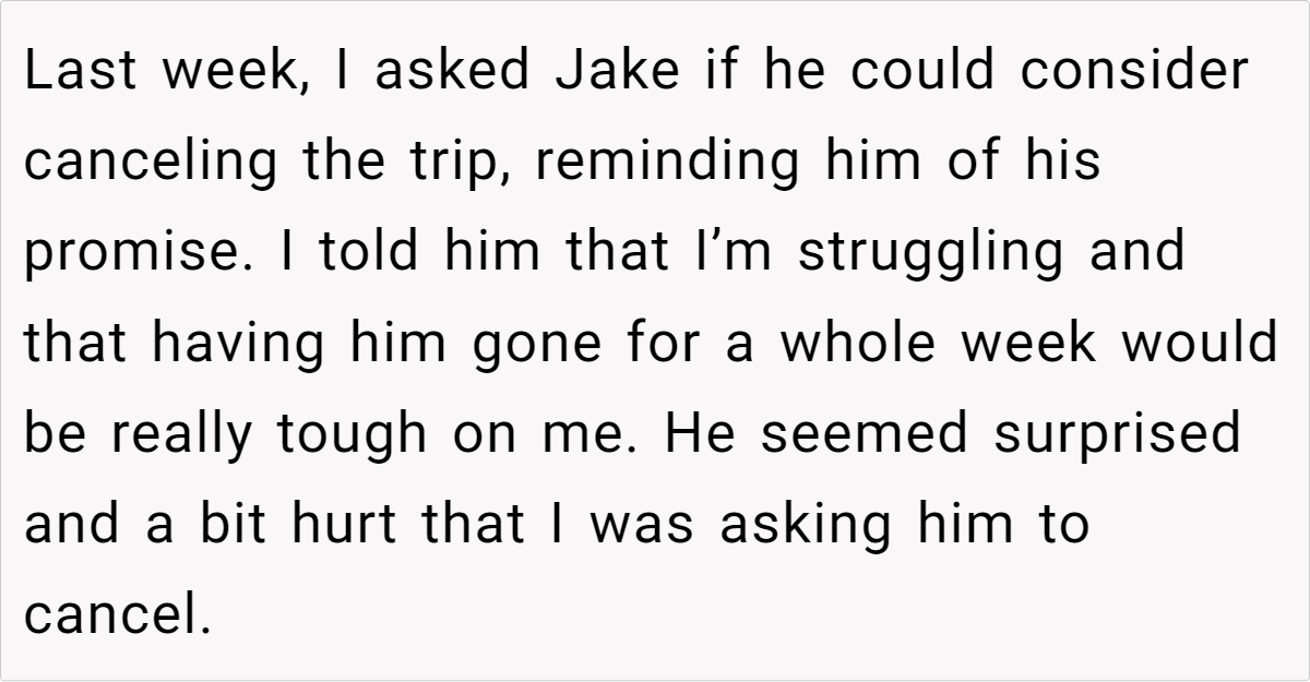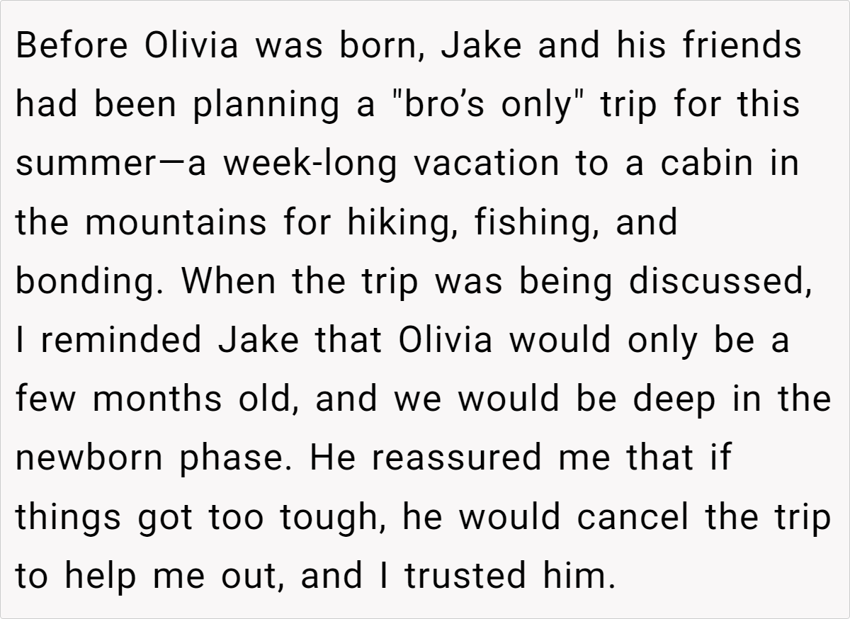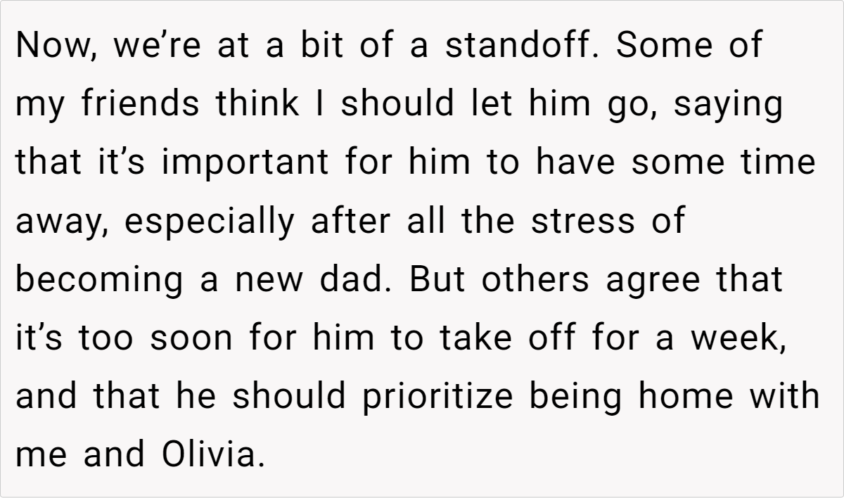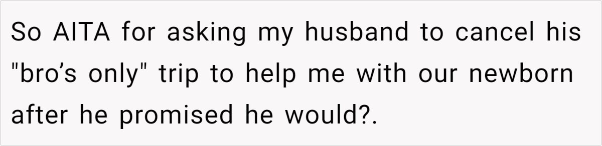 ‘AITA for Asking My Husband to Cancel His “Bro’s Only” Trip to Help Me With Our Newborn After He Promised He Would?’