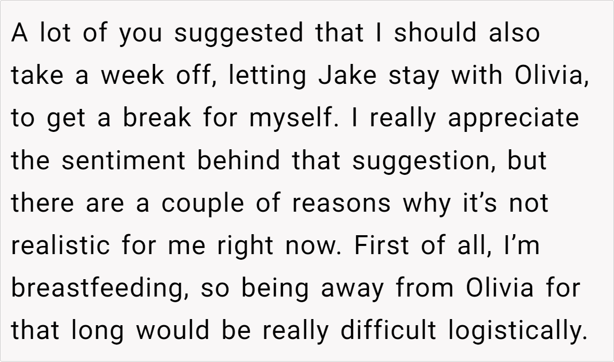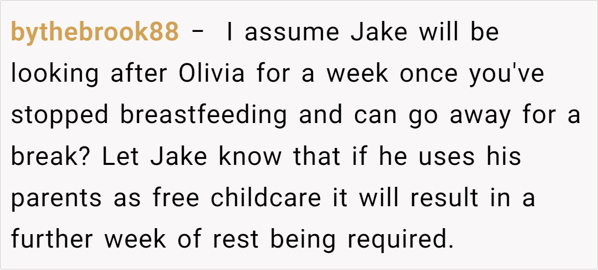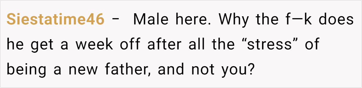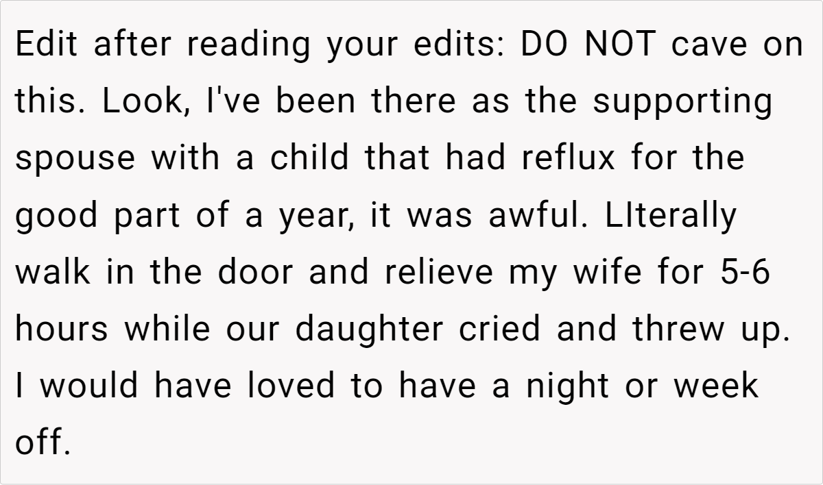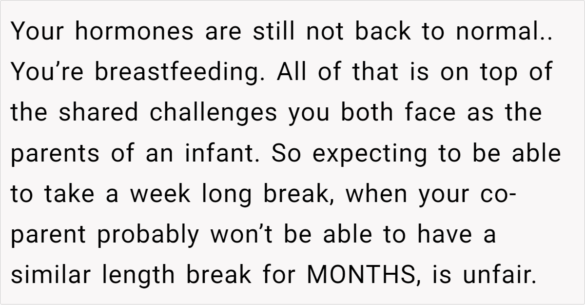These opinions highlight that while some believe a breather is necessary for every parent, many agree that when promises are made, they should be honored—especially in the delicate realm of early parenthood.