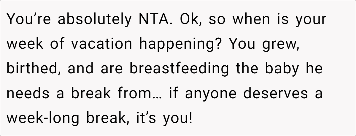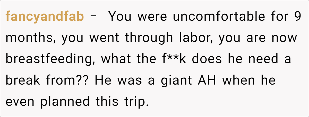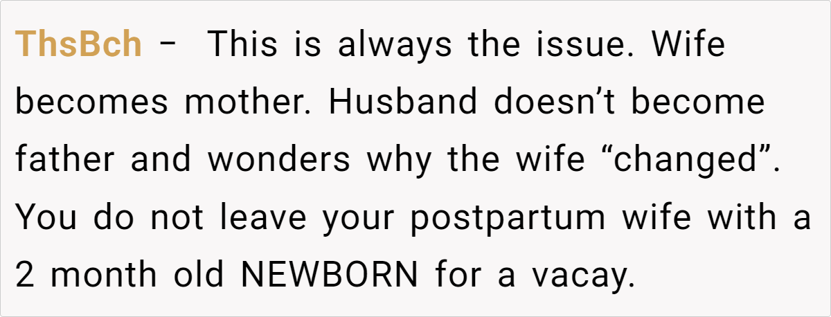 In conclusion, this story serves as a reminder of the importance of balancing personal desires with family responsibilities during the newborn phase. While taking a break is understandable, the commitment to support a partner during overwhelming times remains a cornerstone of a strong relationship. What do you think? How should couples navigate the tension between long-awaited personal time and the immediate needs of a growing family? Share your thoughts and experiences—your insights might help others in similar situations.