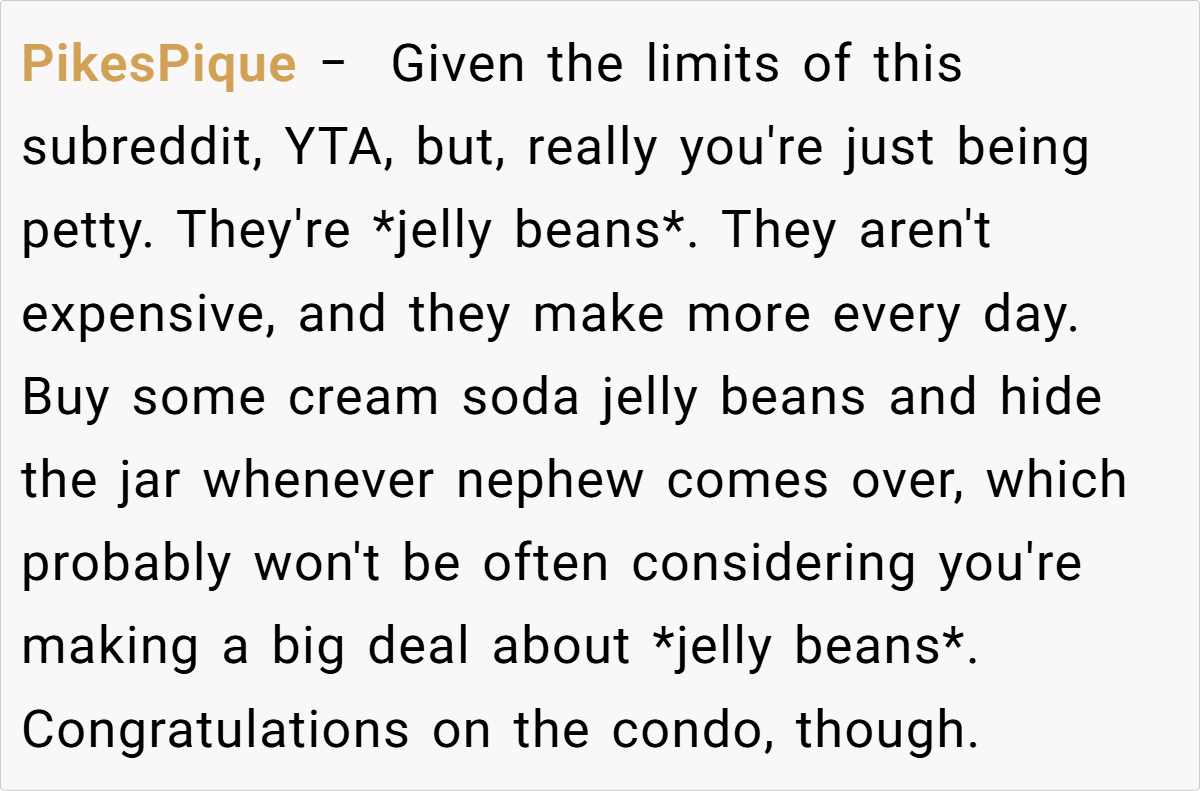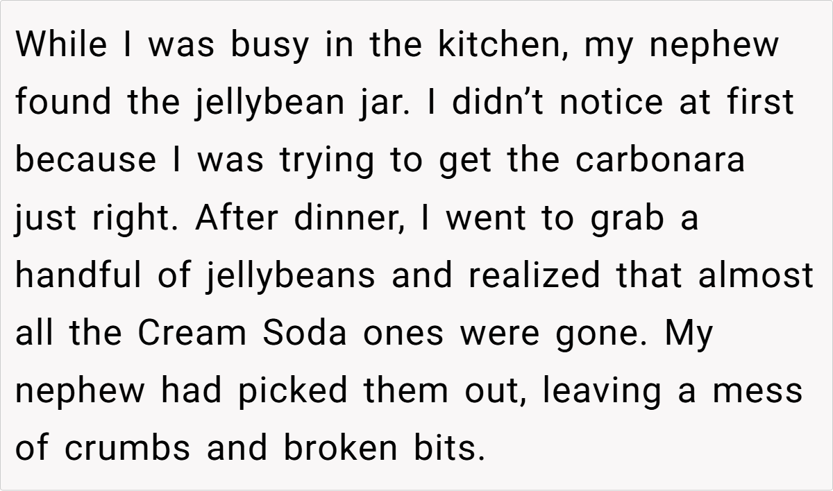 A celebratory dinner meant to showcase a new home and culinary skills spiraled into conflict when a 7-year-old nephew devoured his aunt’s prized Cream Soda jellybeans. The dispute—rooted in parenting styles, hospitality norms, and respect for personal belongings—has divided Reddit, forcing us to ask: When does a “small” issue reveal bigger family fractures?