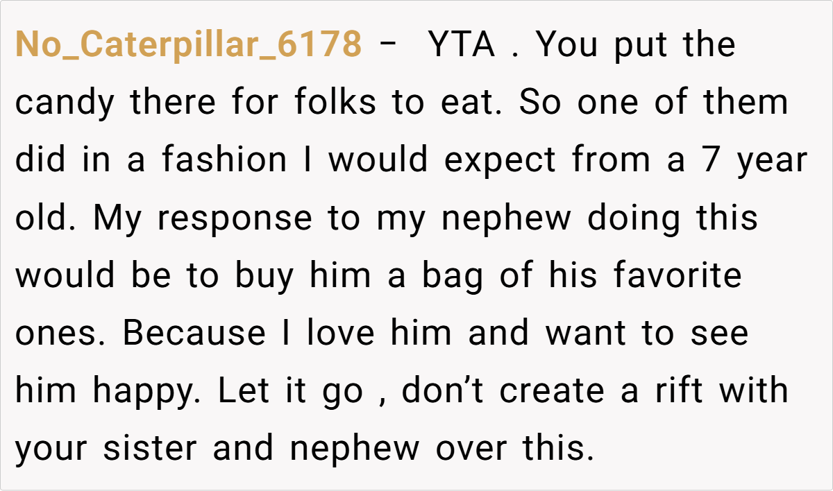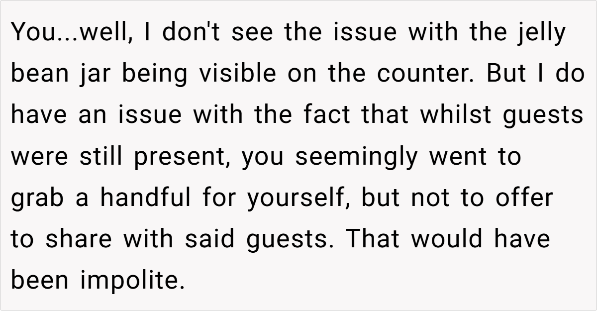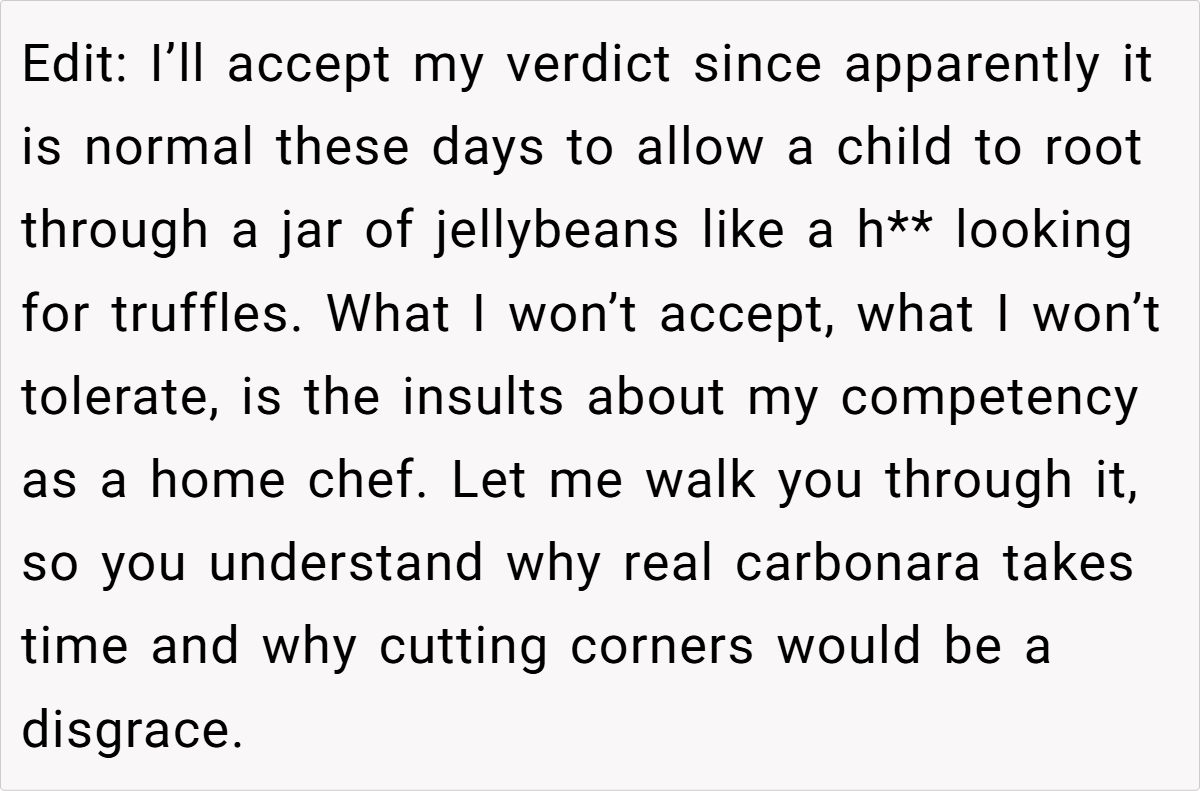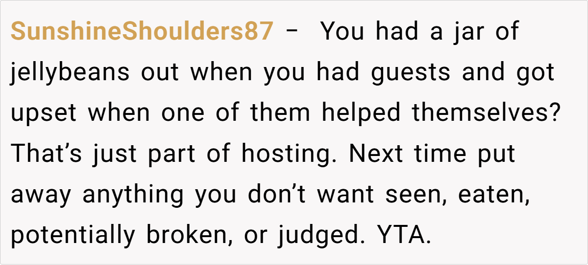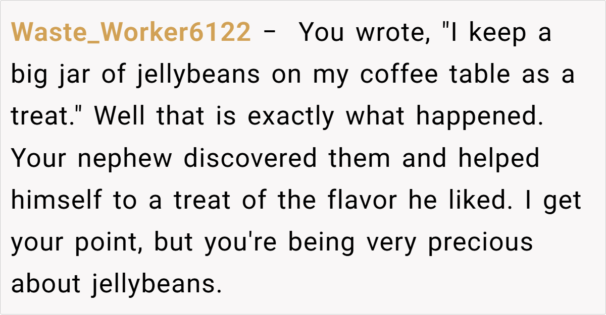 Reddit reactions split sharply. Critics called OP “petty” for prioritizing candy over family harmony, arguing hosts should expect guests to indulge. Supporters condemned the nephew’s behavior and Laura’s dismissal, framing it as a teachable moment. A minority mocked OP’s “elitist” carbonara details, though most agreed intent mattered: Was the jar a shared treat or a personal stash?