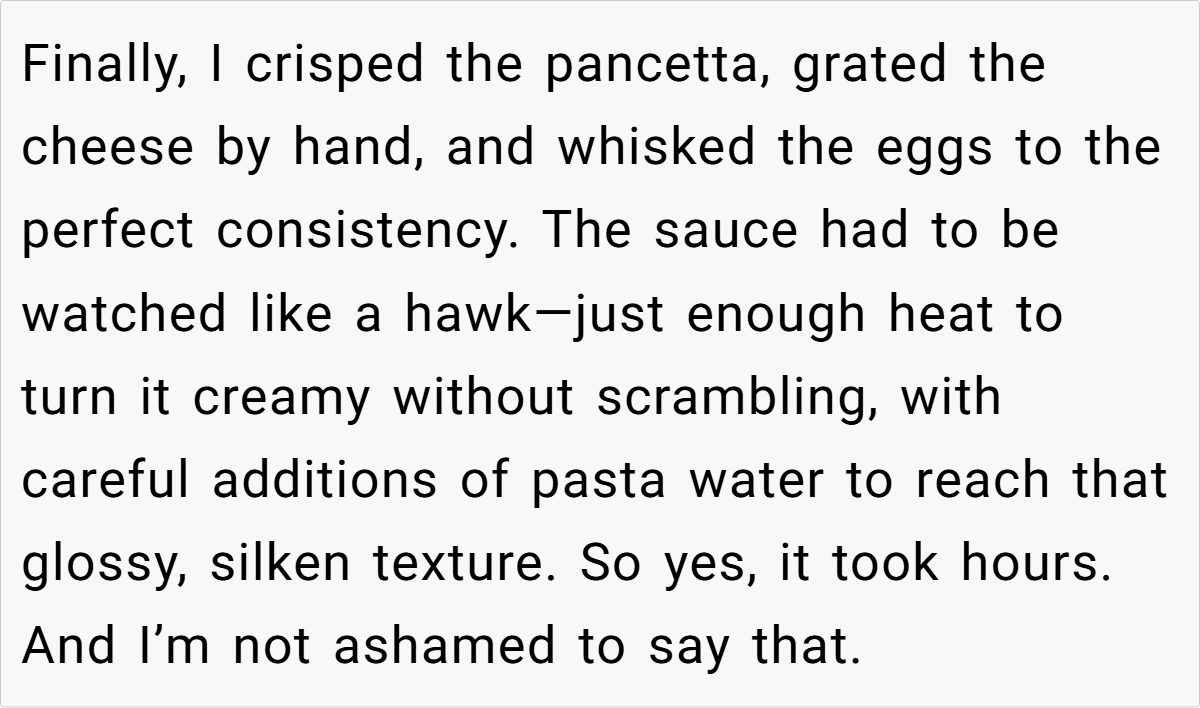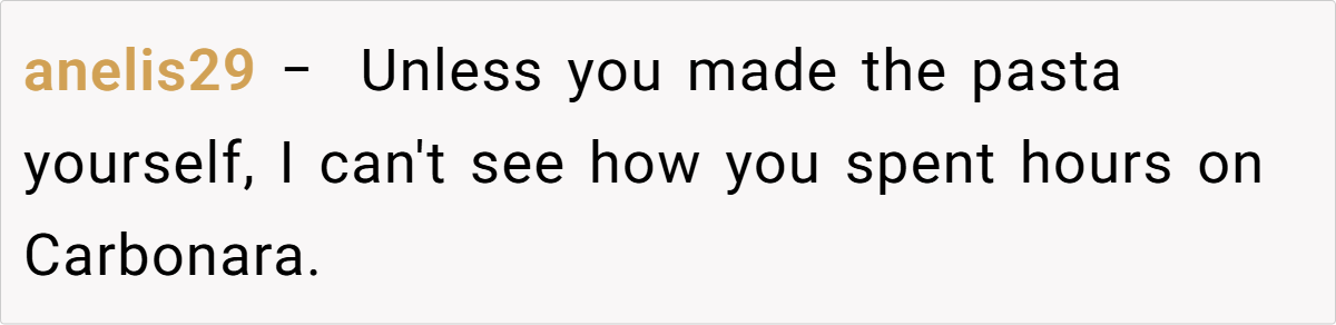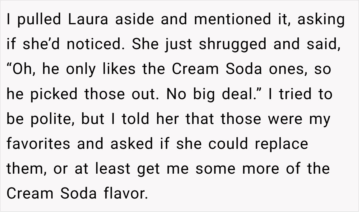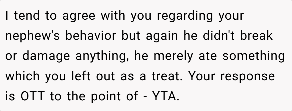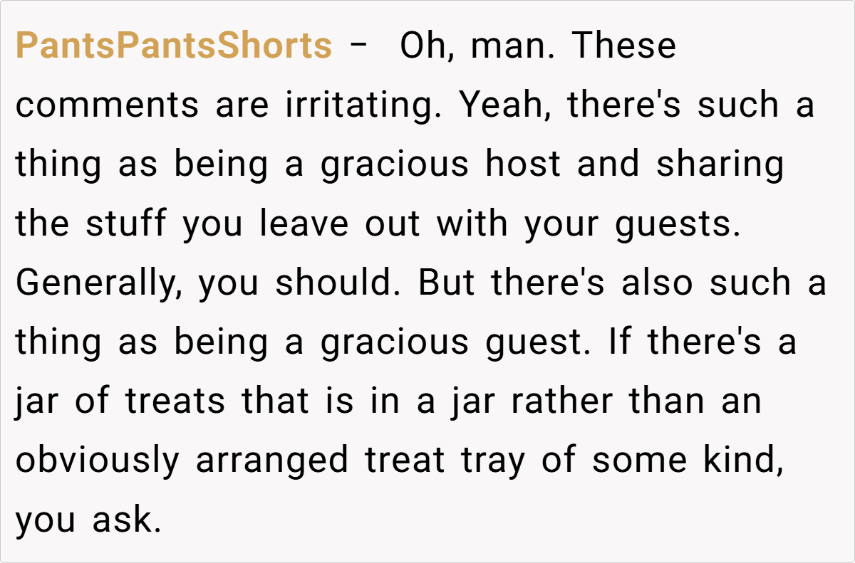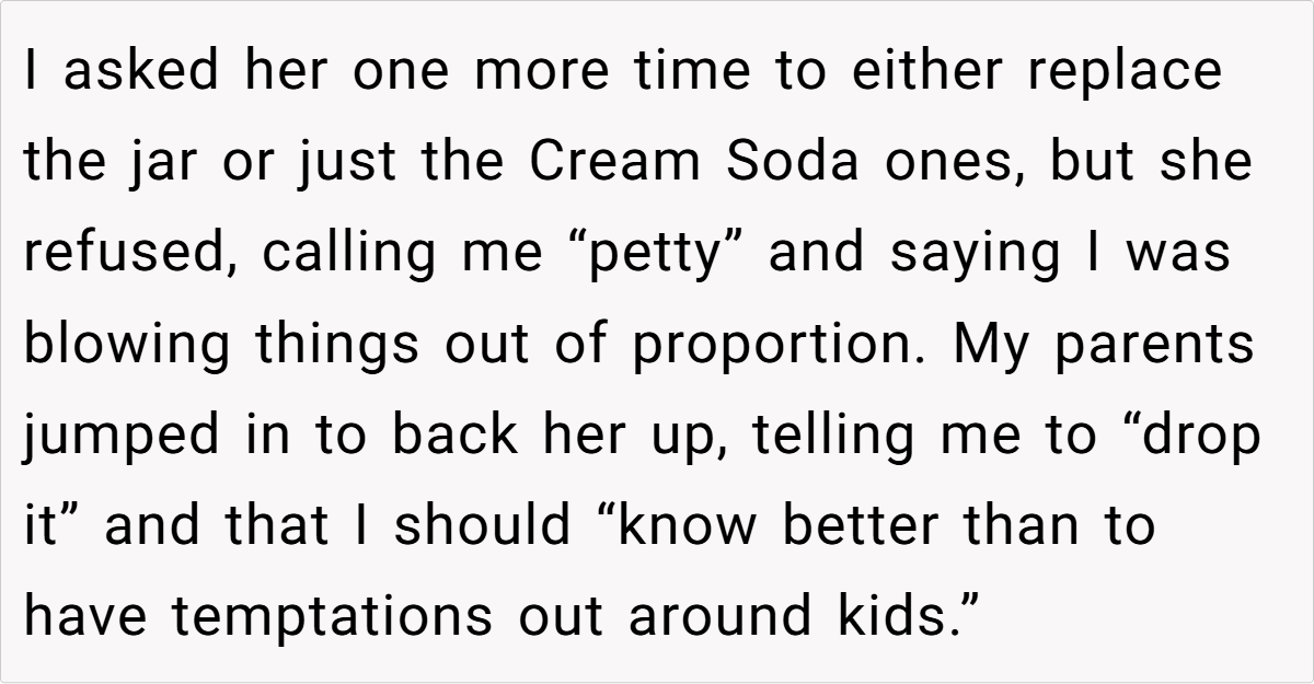 Reddit reactions split sharply. Critics called OP “petty” for prioritizing candy over family harmony, arguing hosts should expect guests to indulge. Supporters condemned the nephew’s behavior and Laura’s dismissal, framing it as a teachable moment. A minority mocked OP’s “elitist” carbonara details, though most agreed intent mattered: Was the jar a shared treat or a personal stash?