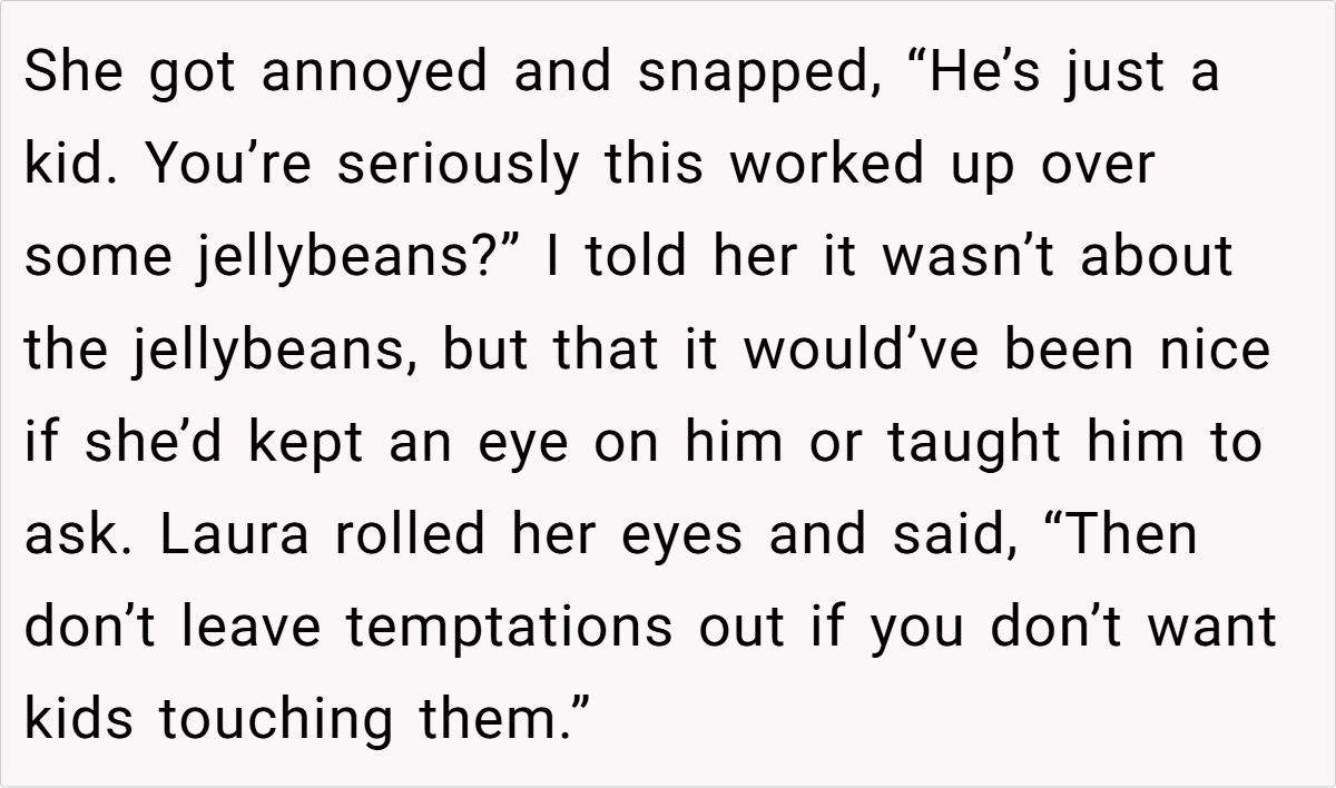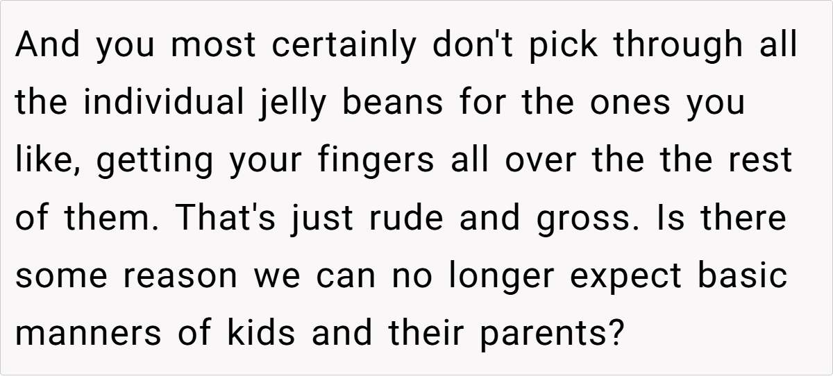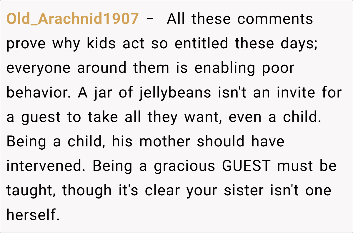 This jellybean saga highlights how “trivial” disputes can unmask deeper familial rifts. While the candy’s cost was negligible, the principles at stake—respect, accountability, and parenting philosophies—are anything but small.
