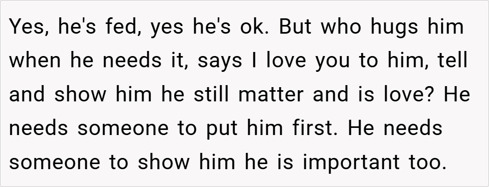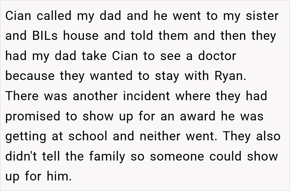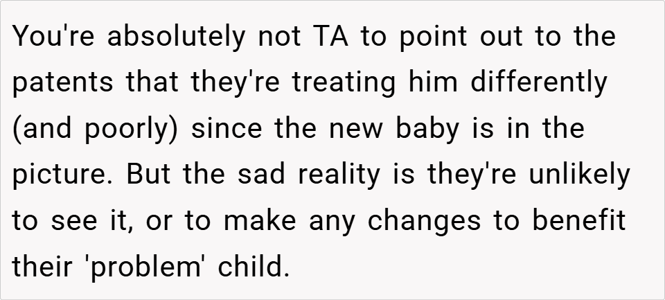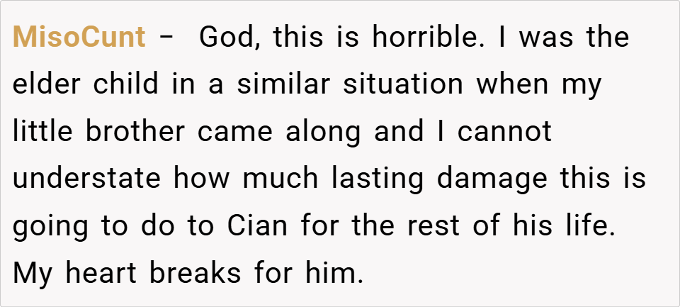 This situation highlights the challenges of parenting multiple children and the importance of balancing attention to ensure each child feels valued. While the writer’s confrontation may have been blunt, it underscores the need for her sister and brother-in-law to address Cian’s emotional needs and repair their relationship with him. What do you think? Was the writer right to call out her sister’s parenting, or should she have approached the situation differently?