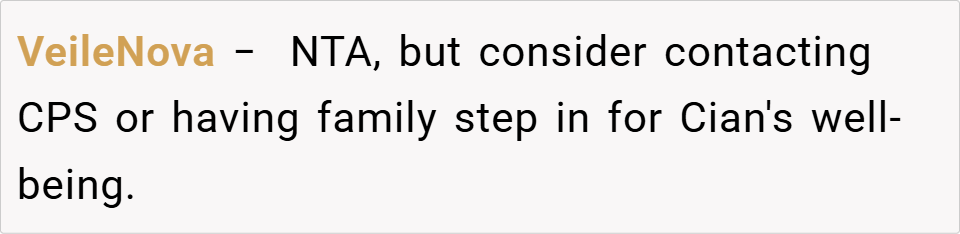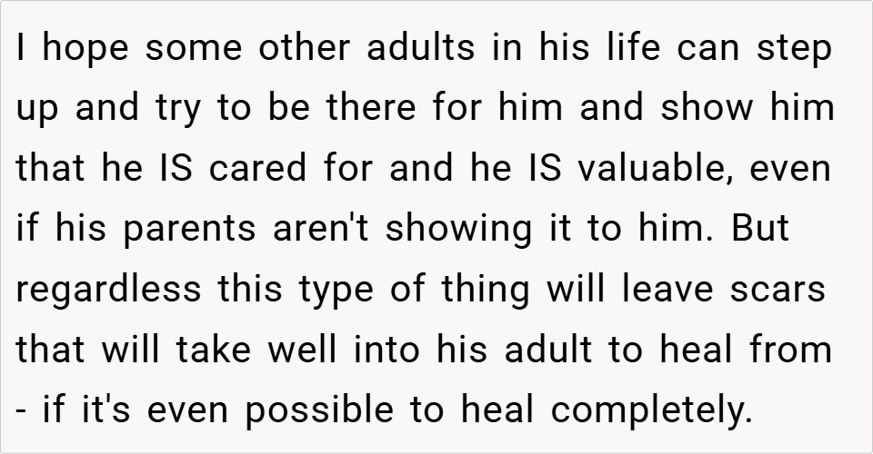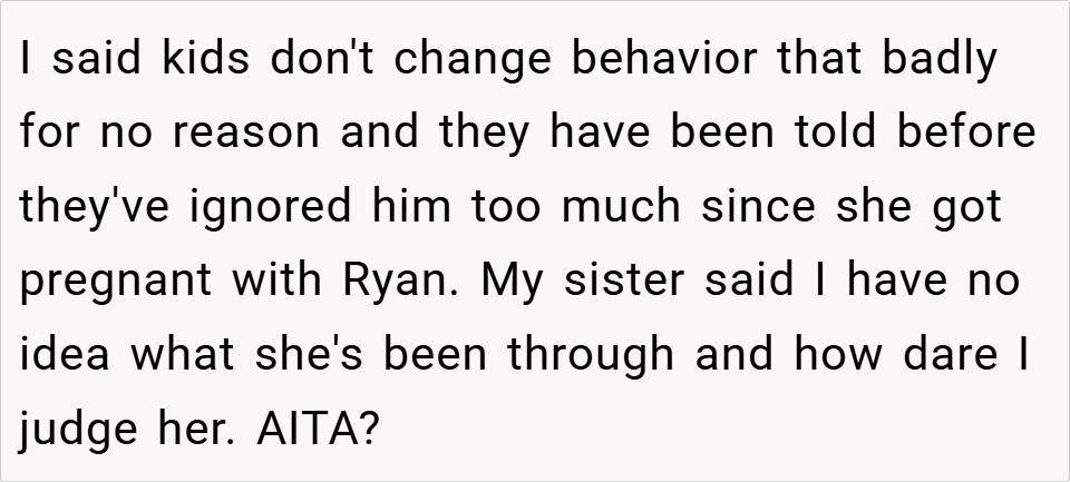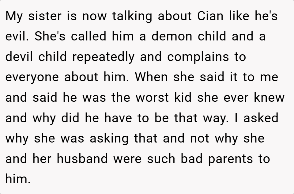 Supportive Comments: Many Redditors agreed that the writer was justified in calling out her sister’s parenting. They felt Cian’s behavior was a direct result of being neglected and that the parents needed to take responsibility for their actions.
