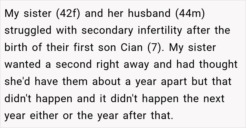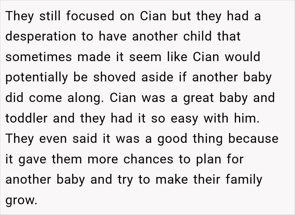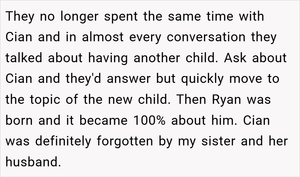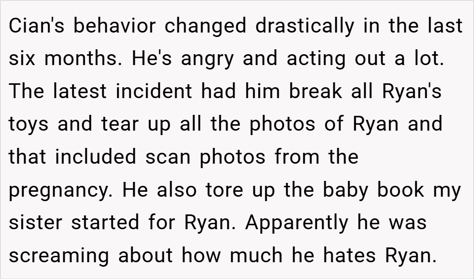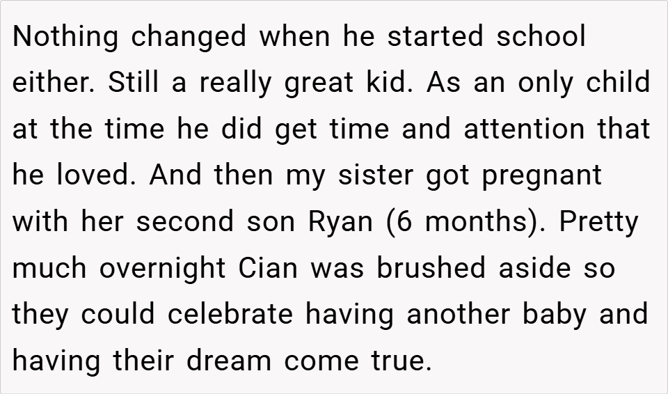 Parenting is a delicate balance, especially when a new child enters the family. For one woman, her sister’s struggle with secondary infertility led to the birth of a second child, but it also resulted in the neglect of her firstborn, Cian. When Cian began acting out, the writer confronted her sister about her parenting, accusing her of ignoring Cian and causing his behavioral issues. Was she right to call out her sister, or was she overstepping? Read the full story below.