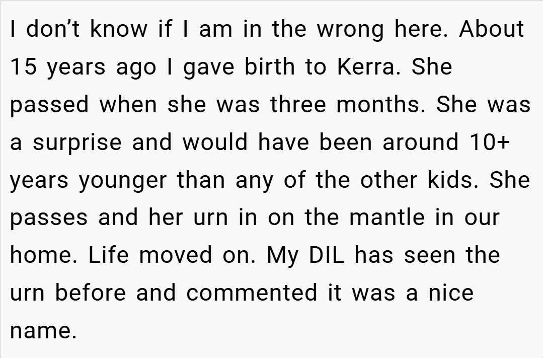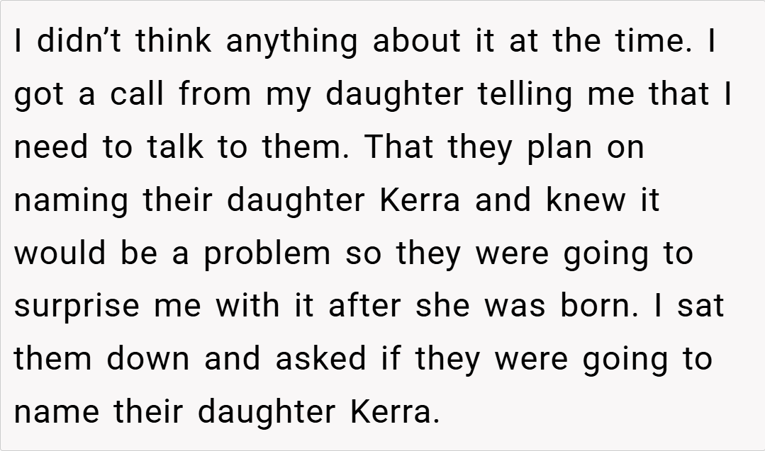The situation escalated when her daughter called, revealing that her son and daughter-in-law were planning to name their unborn daughter Kerra—knowing full well it would hurt. Shocked and overwhelmed by the resurfacing of old grief, she sat them down to express her discomfort.