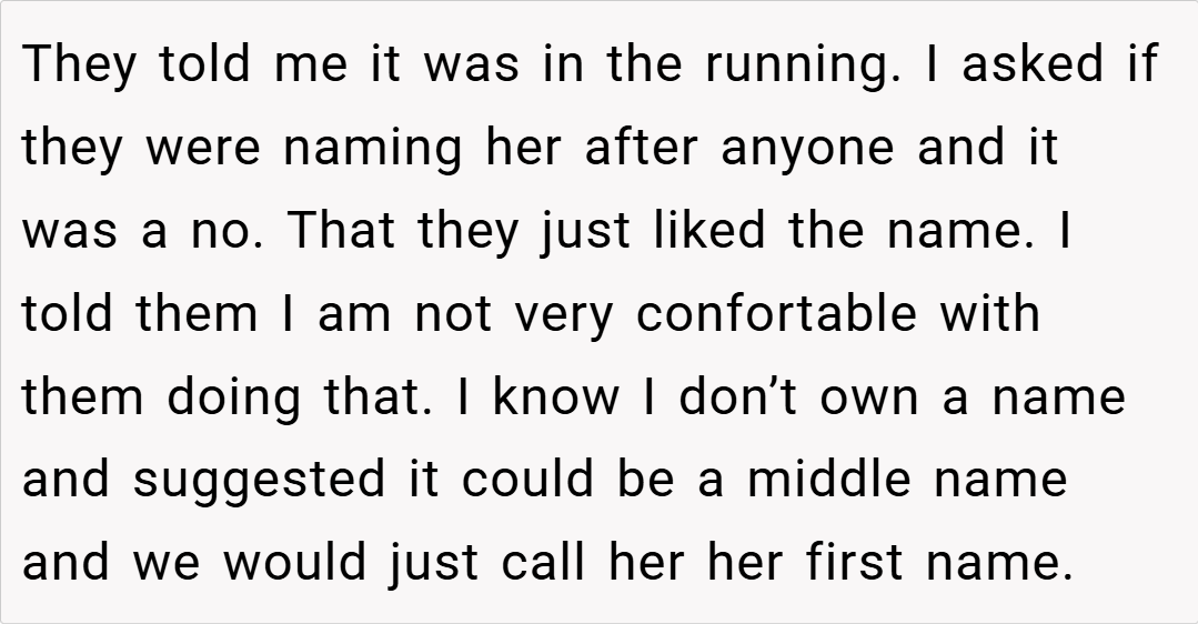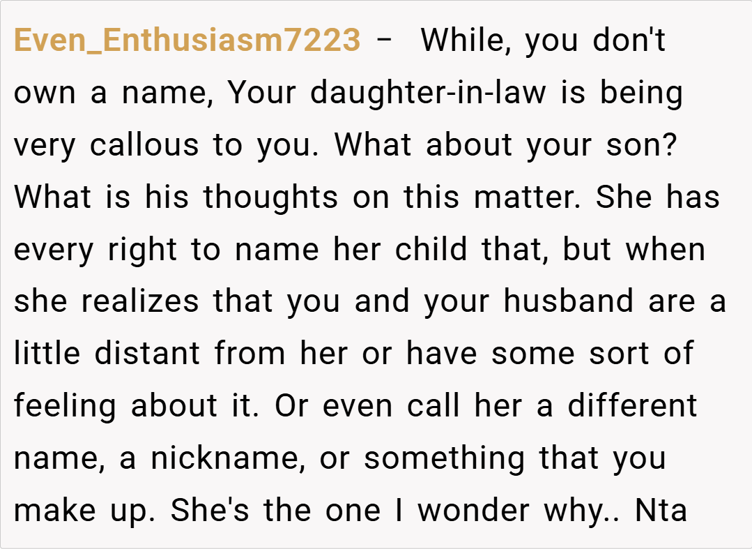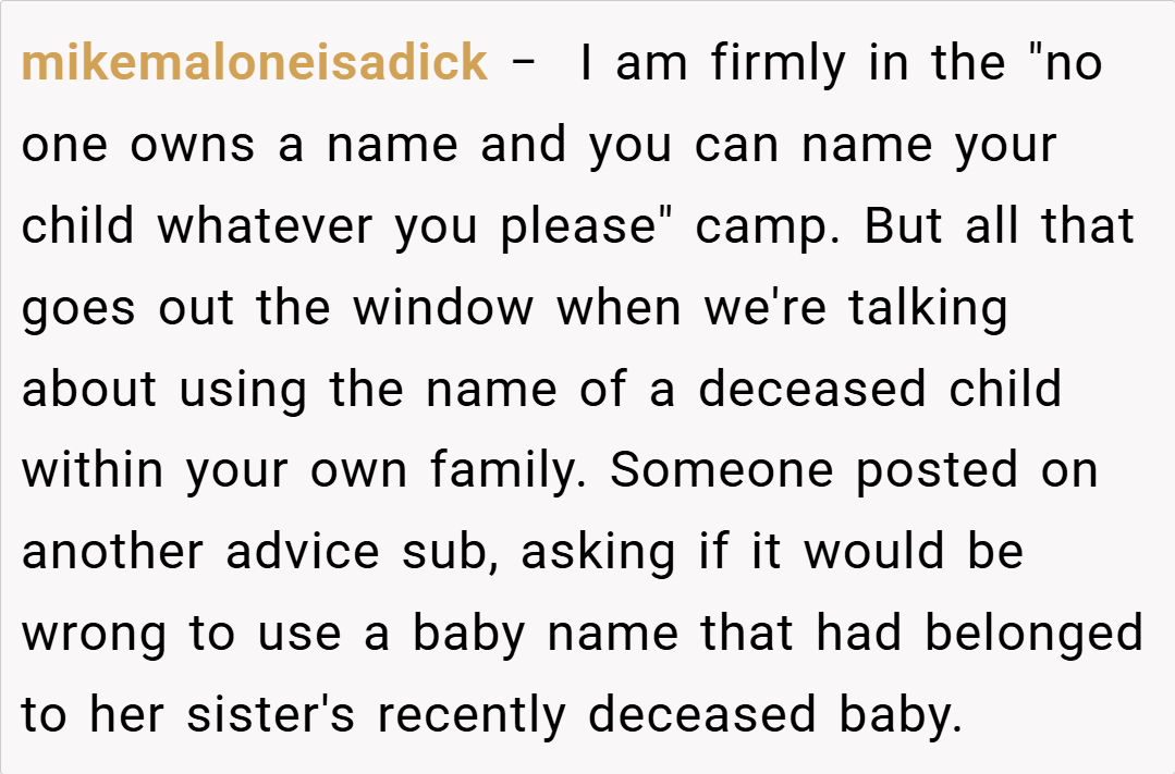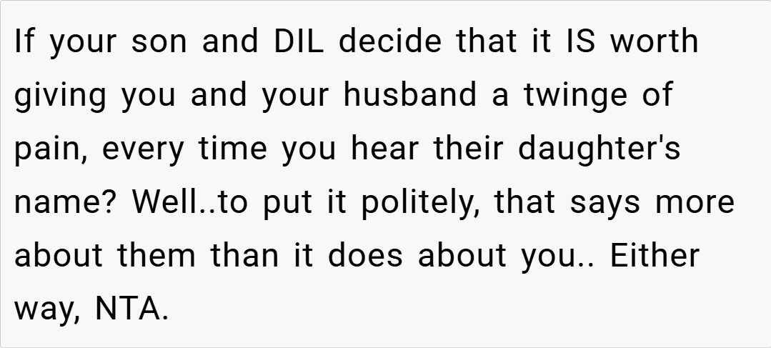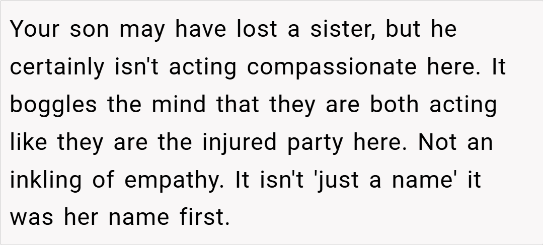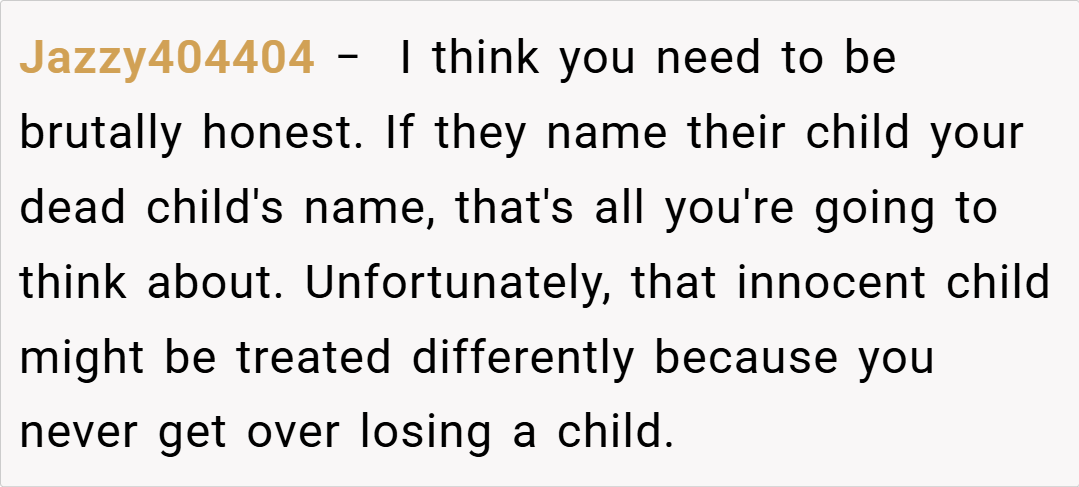 She suggests that, if approached with empathy, the family might find a compromise—perhaps by using the name as a middle name or finding another way to honor the memory of the deceased child without imposing the emotional burden on the new generation. Ultimately, her stance is that while no one owns a name, the emotional legacy attached to it deserves careful handling and respect.