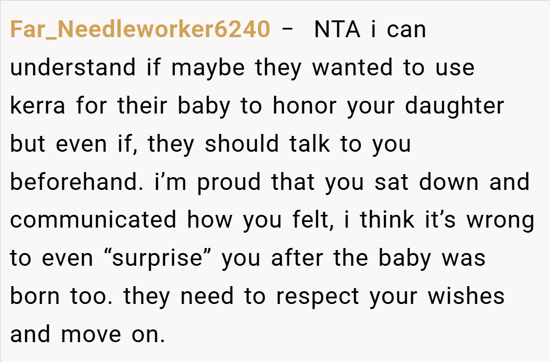 Overall, the Reddit community overwhelmingly supports the OP’s decision. Many commenters agree that since the name Kerra carries deep personal meaning and is tied to the memory of her deceased daughter, it shouldn’t be used casually for another child. They argue that her son and daughter-in-law should have consulted her before deciding on such a significant name.