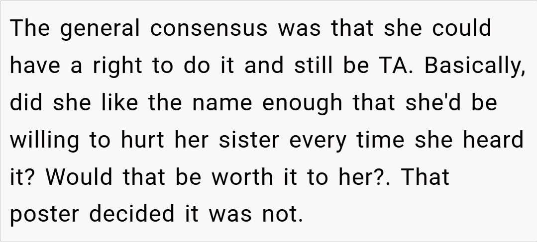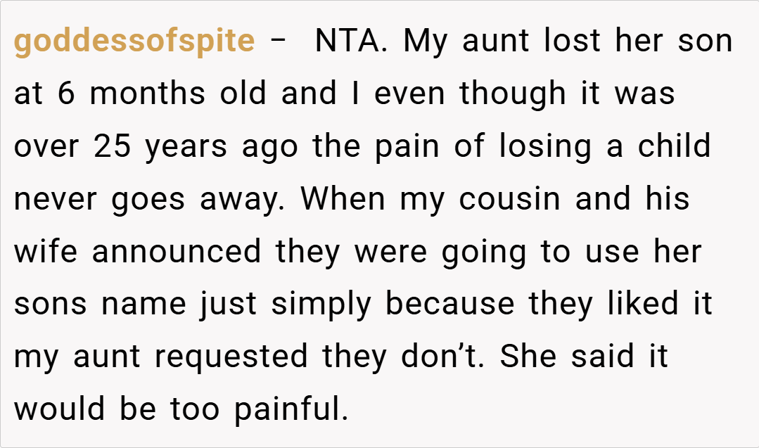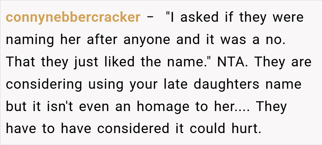 Some users point out that if they truly valued the memory of her daughter, they would honor her feelings instead of choosing the name out of personal preference. While a few voices mention that names are ultimately a personal choice, the prevailing sentiment is that the emotional weight of the name makes it inappropriate to use without thoughtful consideration. In essence, the community feels that the OP is justified in protecting her family’s legacy.