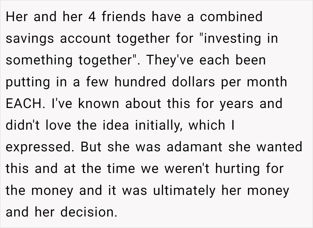 Planning a future together typically involves open communication and shared financial responsibilities. However, when one partner invests in a seemingly ill-conceived project with friends—then balks at tapping those funds for a home down payment—tensions can boil over. That’s precisely the dilemma one Redditor faces: his wife has around $20k tied up in a group savings account with her four best friends, and she refuses to use it to help purchase a jointly owned house.