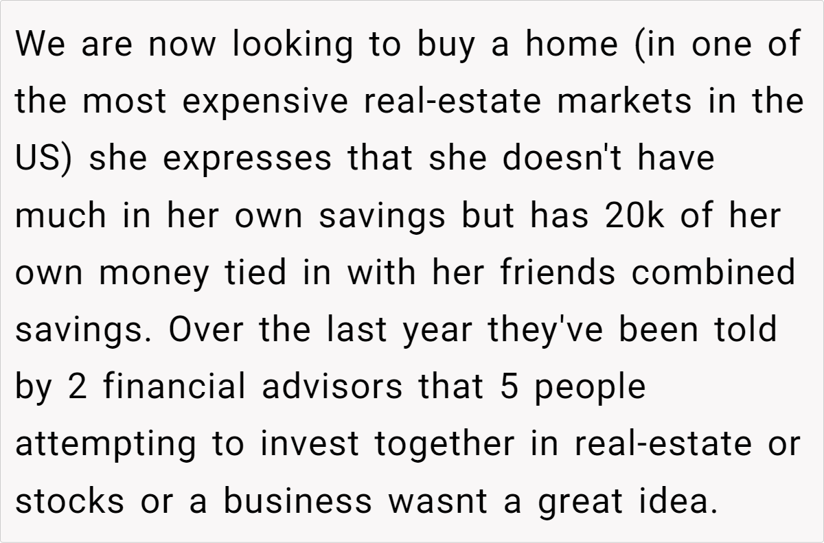 Her argument? She promised her friends the money was for shared investments, even though two separate financial advisors have cautioned against five people pooling their funds in this way. Meanwhile, the husband is prepared to spend nearly all of his own savings—$50k—on a down payment. Is he wrong to ask his wife to chip in from her “friend fund”?