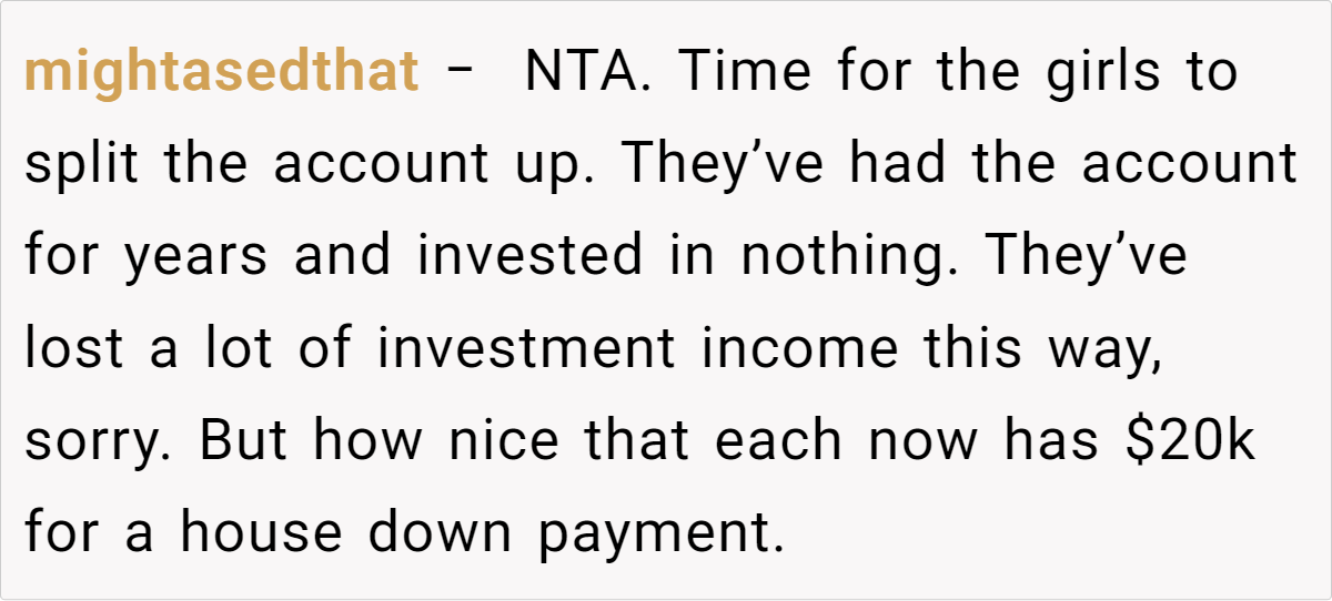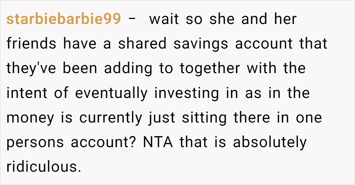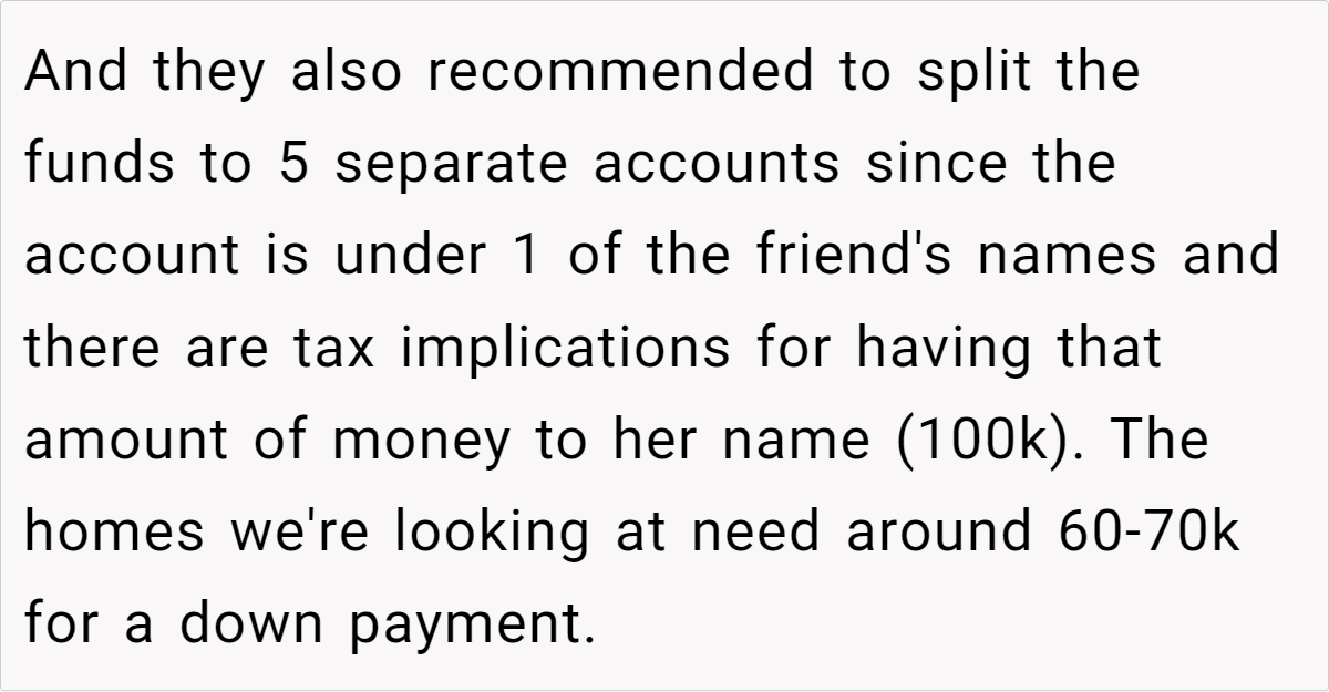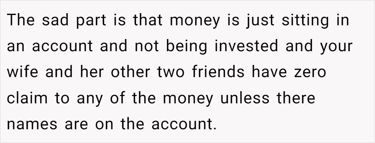 Financial advisors commonly warn that pooling money among five people—especially when it’s all in one person’s name—can lead to complicated tax scenarios, disagreements on usage, and even legal battles down the line. If the wife’s contribution is effectively locked away, it jeopardizes not only her marital finances but her own ability to invest that money wisely.