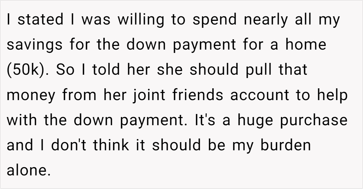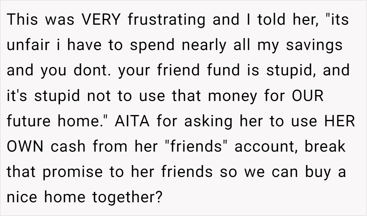 Marriage involves merging lives and, to a large degree, finances. When one spouse is expected to wipe out their savings while the other keeps theirs locked away in a questionable group venture, friction seems inevitable. So, was it really unfair for the husband to ask his wife to use her $20k for their shared future home? We’d love to hear your take: How would you handle a large down payment if one partner’s money is “off-limits”? Are friend-based “investment funds” ever a good idea? Share your stories and insights below.