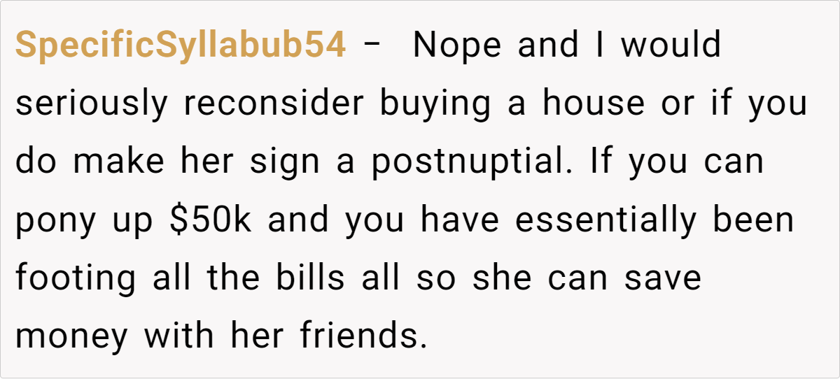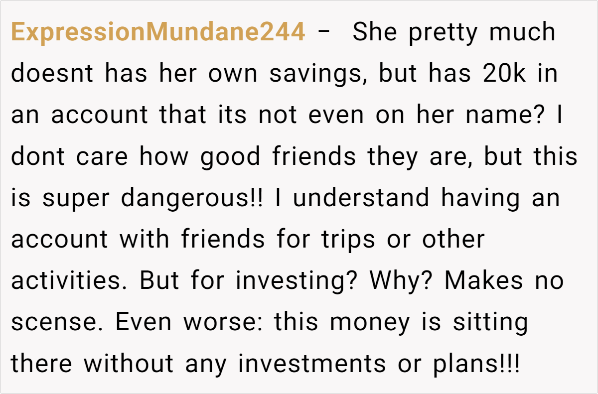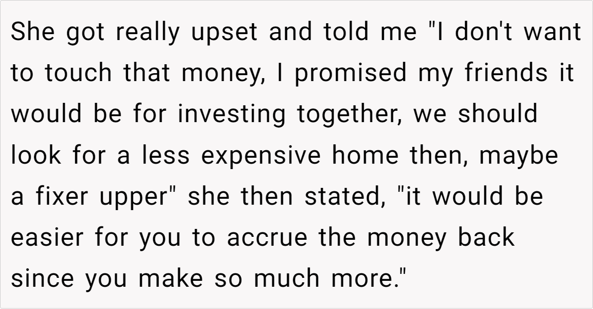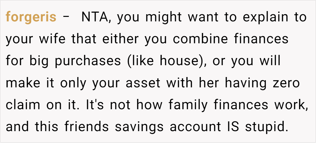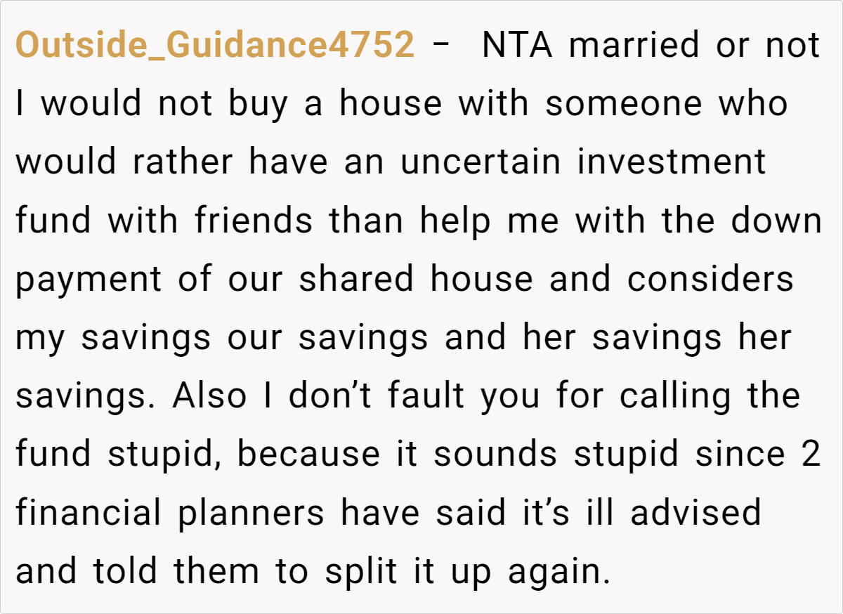Many found the wife’s friend fund arrangement too risky and impractical, especially given two financial advisors’ warnings. Users also pointed out that she’s effectively leaving her husband to bear most of the financial weight for the house—even though it’s a mutual asset they both want.