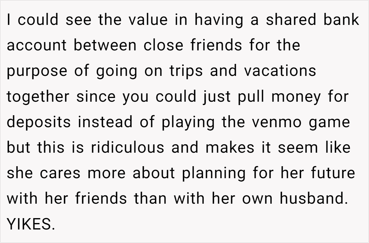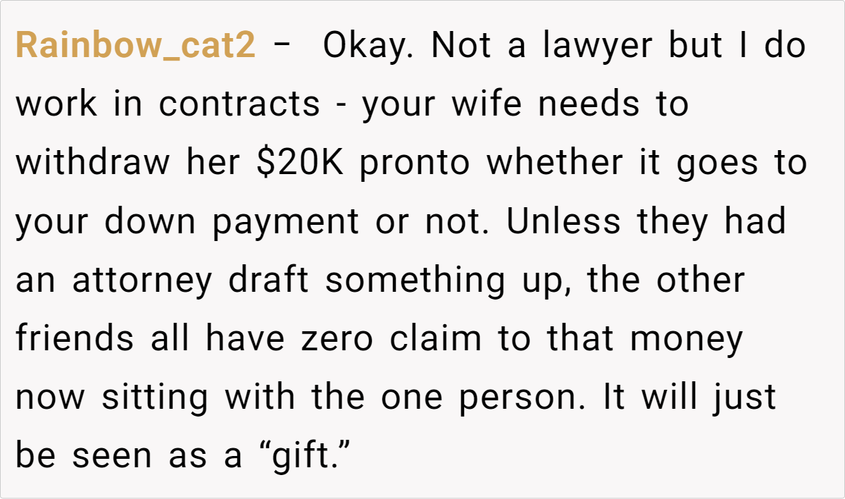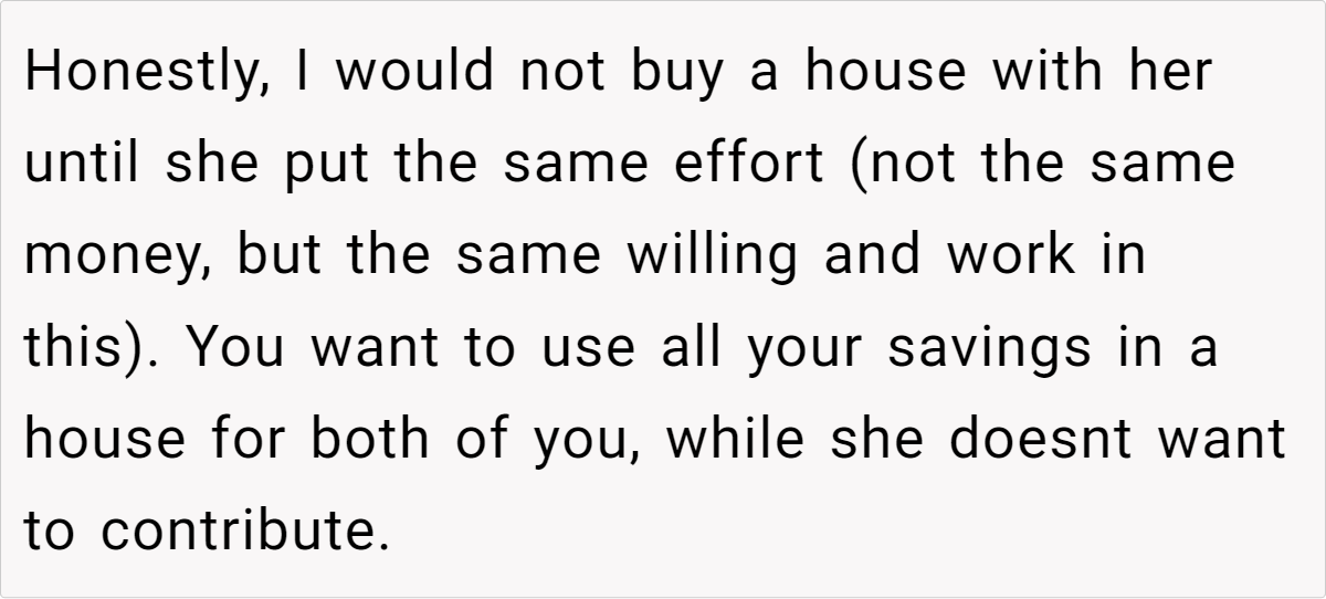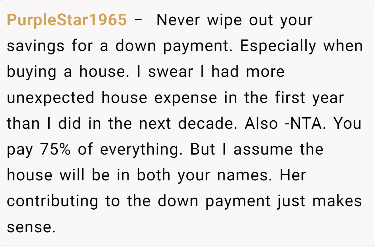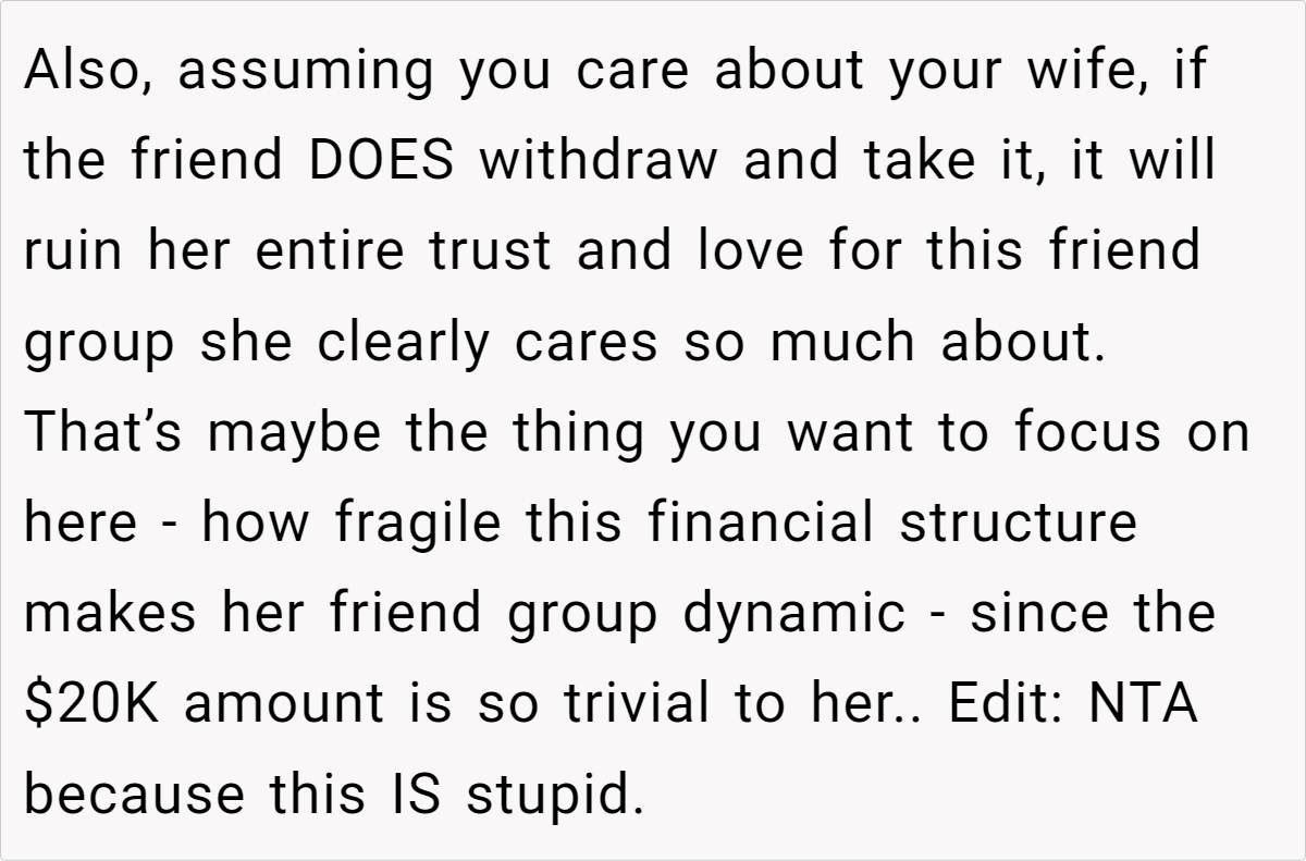 Many found the wife’s friend fund arrangement too risky and impractical, especially given two financial advisors’ warnings. Users also pointed out that she’s effectively leaving her husband to bear most of the financial weight for the house—even though it’s a mutual asset they both want.