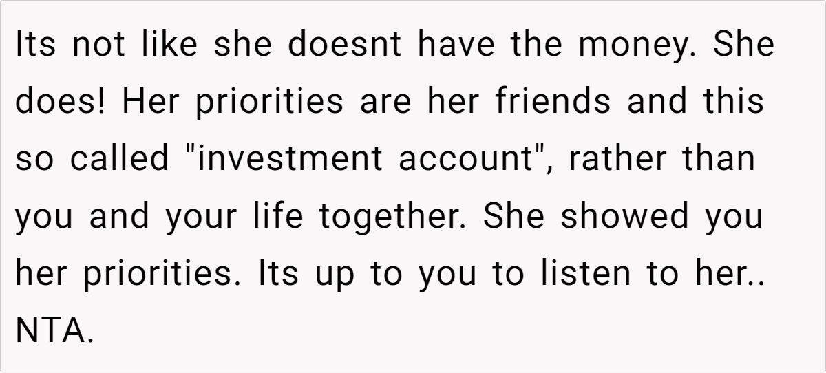It’s not about matching dollar for dollar; it’s about the spirit of meeting each other halfway. When the wife insists on preserving her friend investment at the expense of their shared dream home, she’s effectively privileging her friend group’s plan over her marital goals.