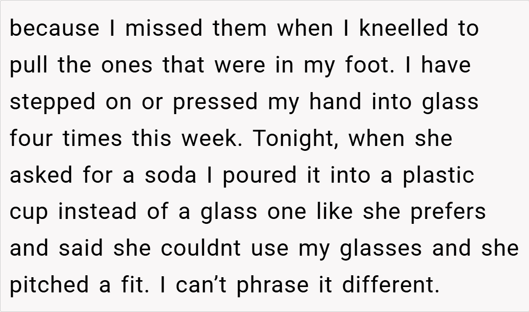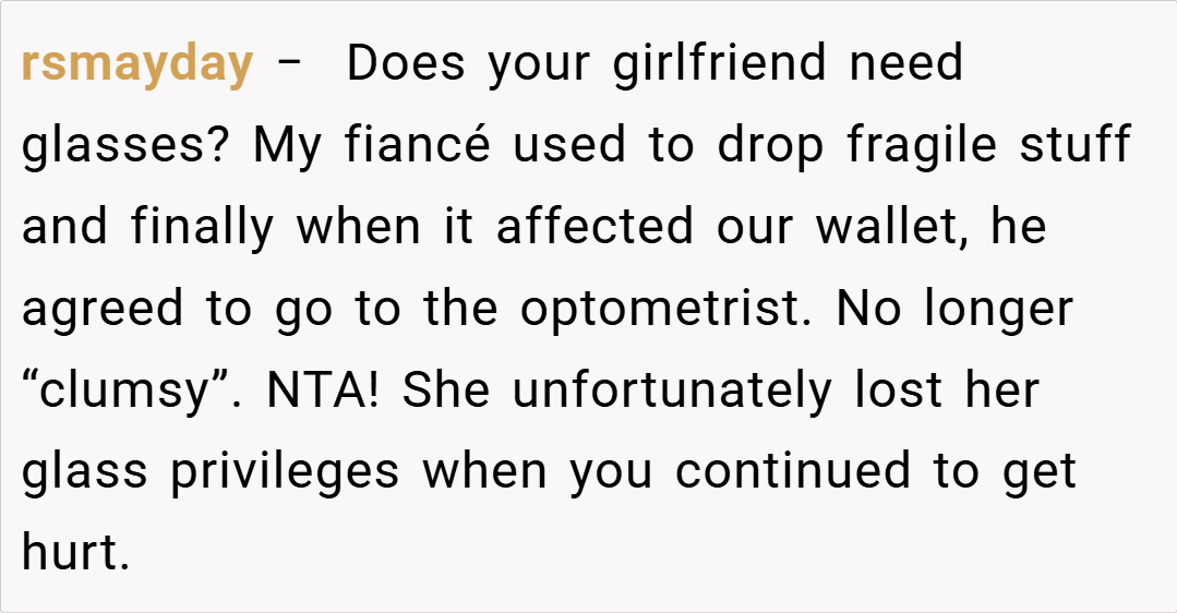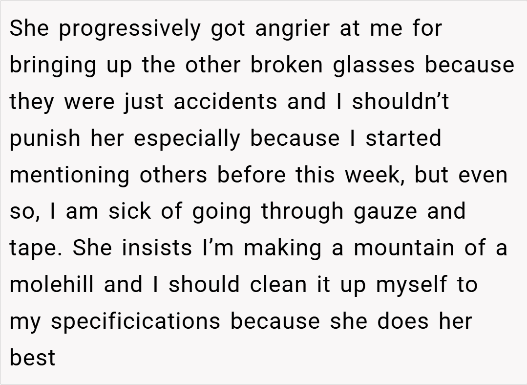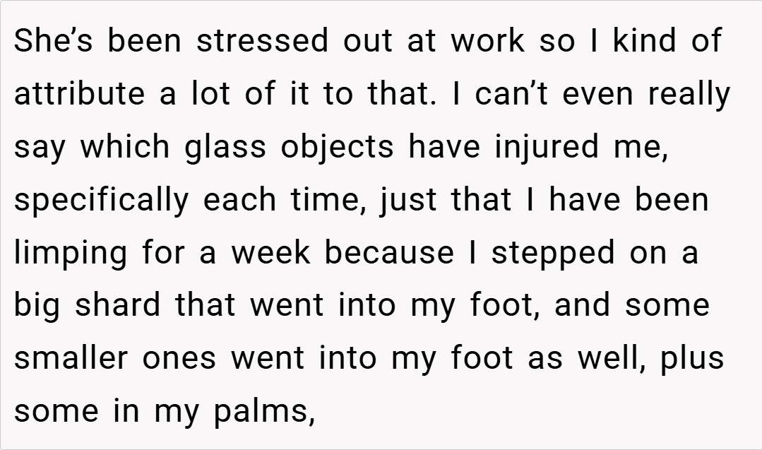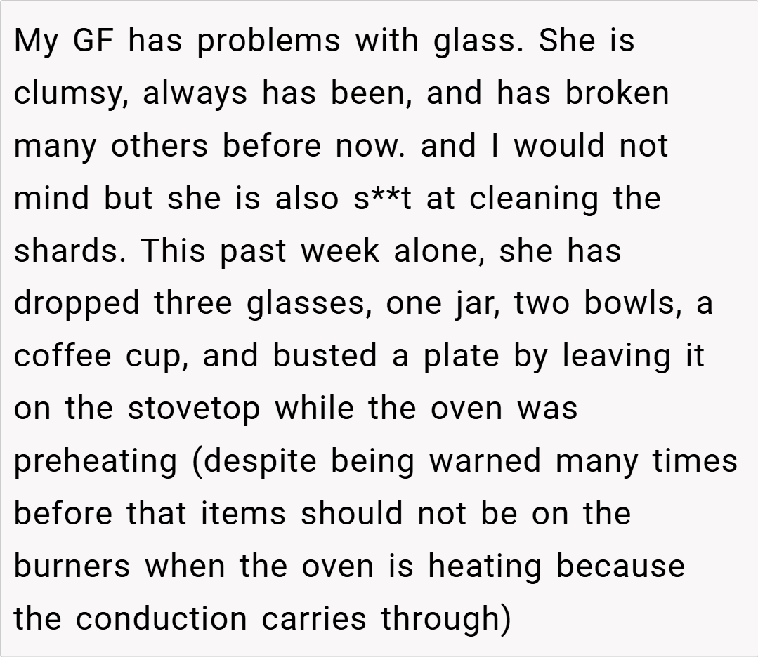 The sound of shattering glass can be jarring. Now imagine hearing that sound multiple times a week in your own home, followed by the sharp pain of glass shards piercing your skin. For one Reddit user, this nightmarish scenario became an everyday reality when his girlfriend’s clumsiness with glassware led to repeated injuries and a relationship on edge. While accidents happen to everyone, at what point does a pattern of “accidents” become a serious issue that needs addressing?