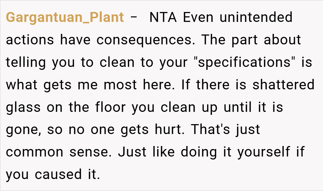 According to (Dr. Sarah Ravin), a clinical psychologist: “When a person repeatedly causes accidents and responds with a defensive attitude rather than a caring attitude, this creates a worrying relationship.” The girl’s attitude of asking her boyfriend to “clean up after himself to his standards” shows an alarming lack of responsibility.