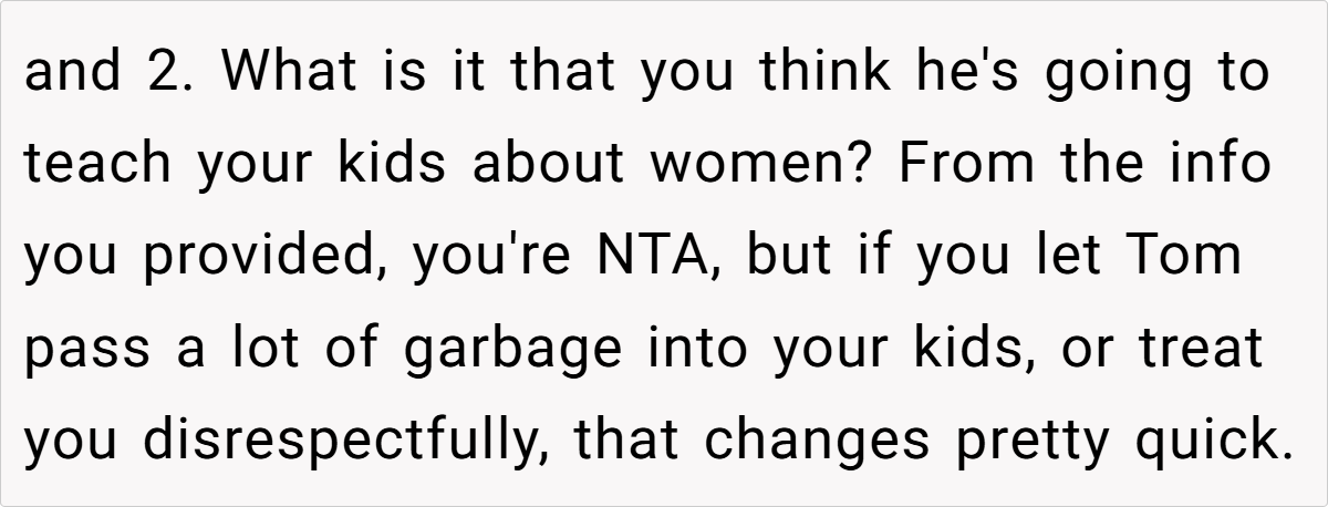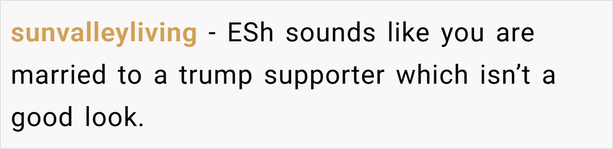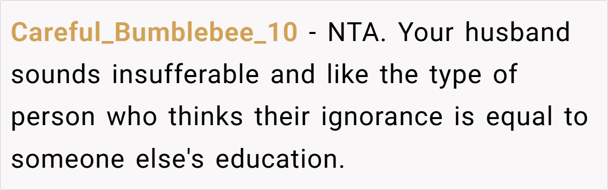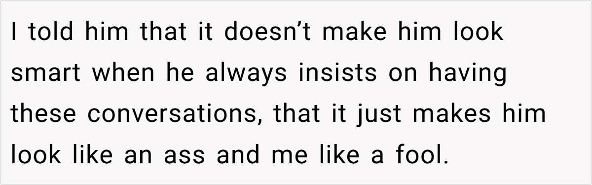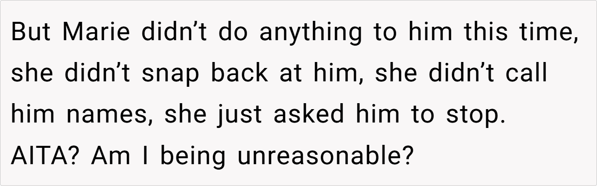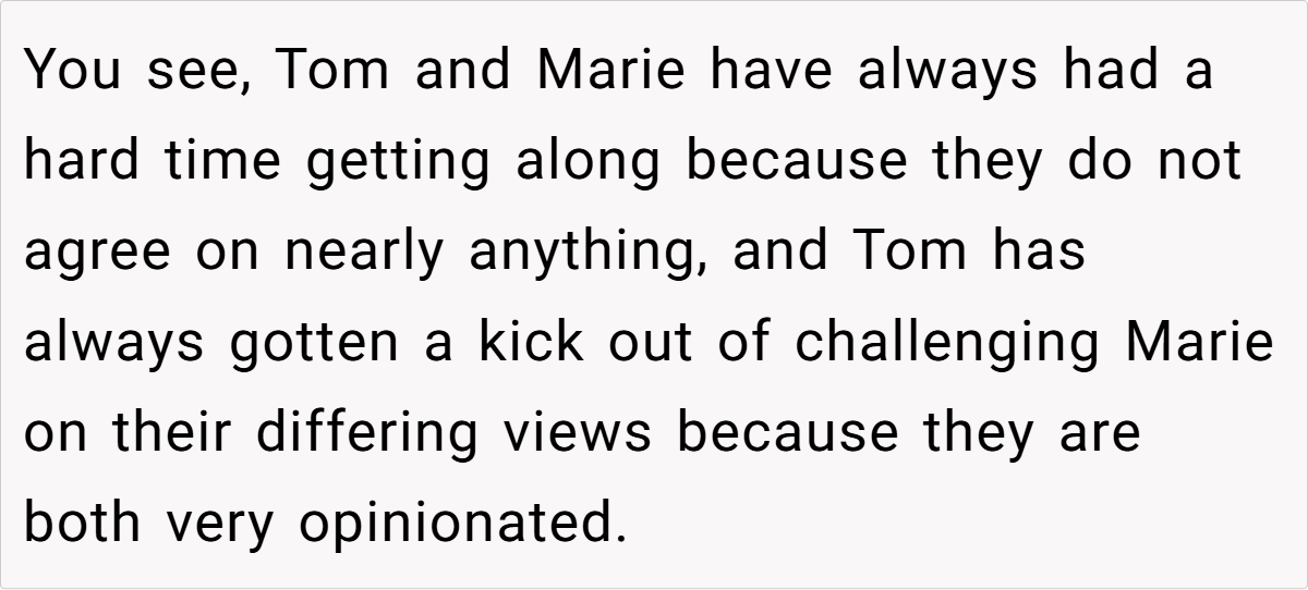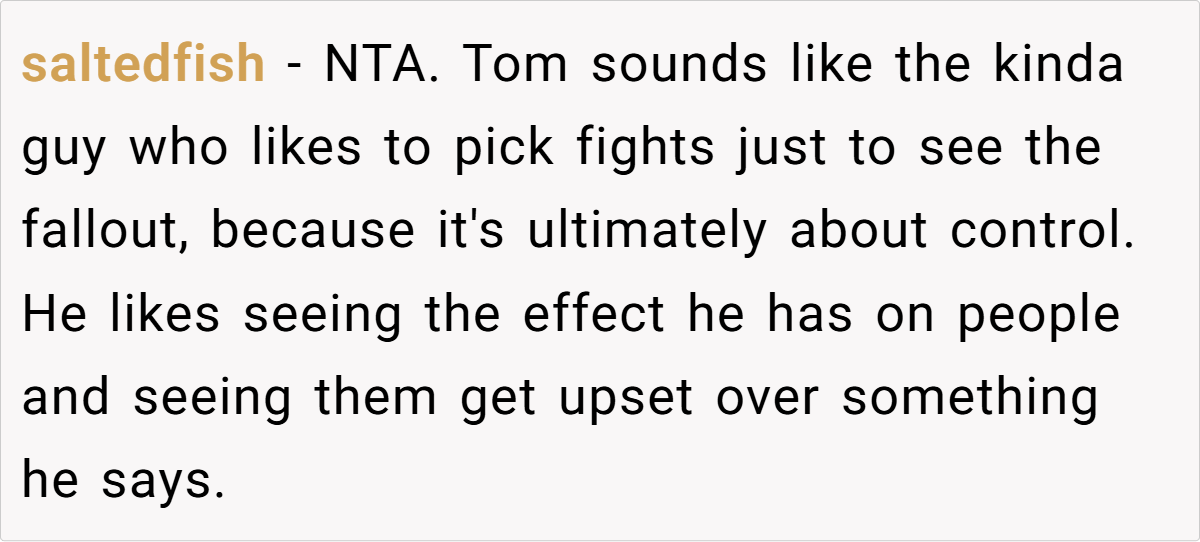 By repeatedly pushing topics he knows Marie finds sensitive, Tom is prioritizing his amusement over family harmony. This is often seen as a form of emotional manipulation, where one person intentionally provokes another just to assert dominance in the conversation. OP was right to call out her husband—Marie had clearly set boundaries by blocking him on social media, and yet he continued to poke the bear.