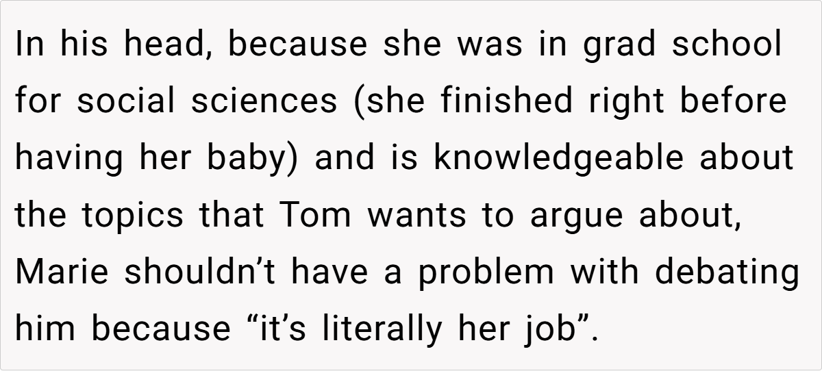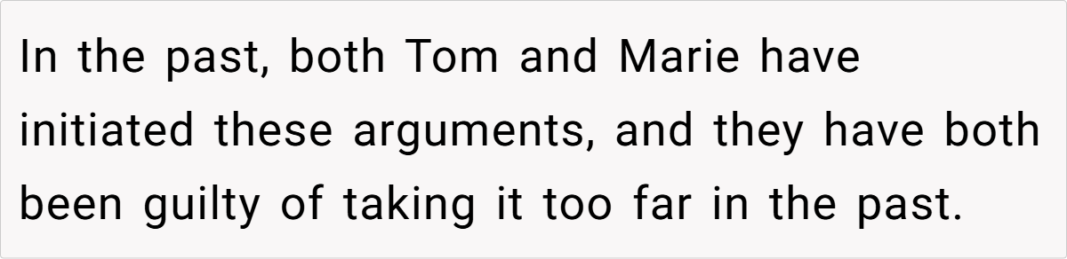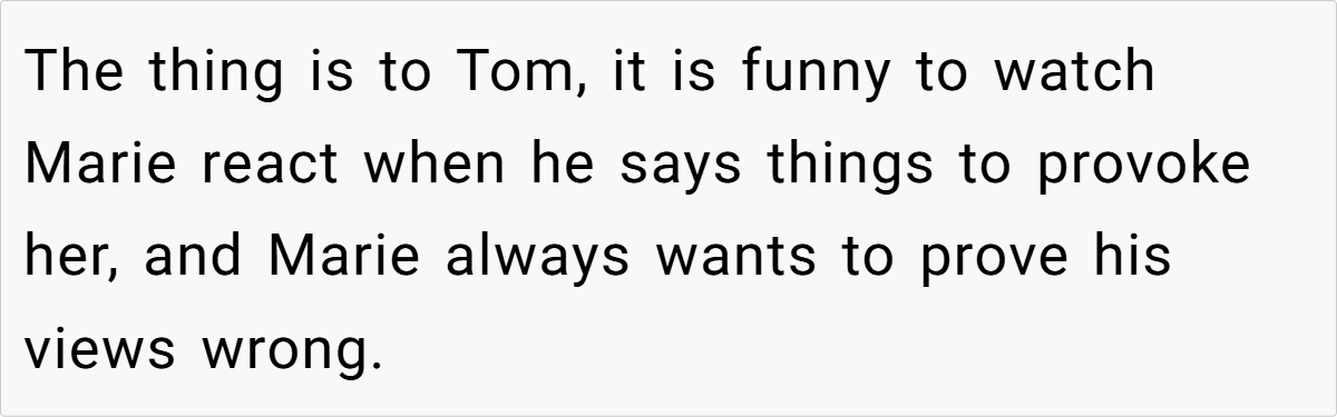 Marie, after becoming a mom, likely shifted her priorities and energy, making Tom’s antics feel more like an unwanted stressor than an interesting discussion. This is a psychological shift that many new parents experience—where protecting peace becomes more important than engaging in fruitless debates.