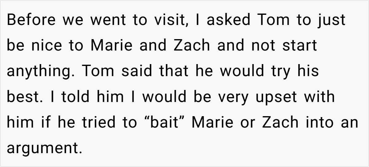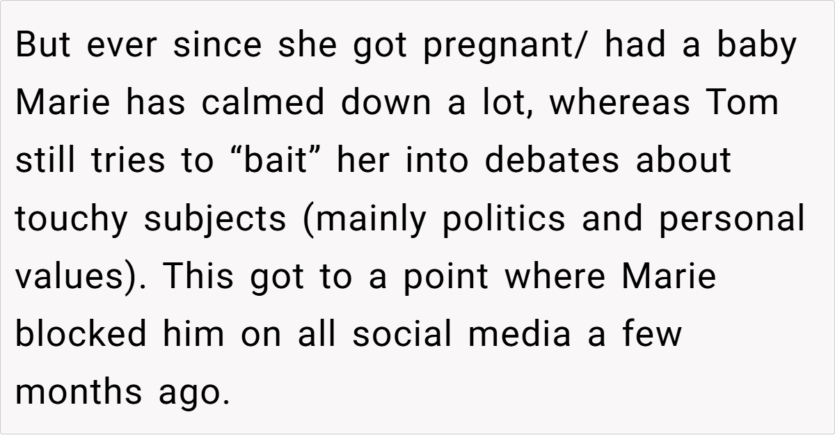 Some people enjoy debating, but when does it stop being a discussion and start being provocation? OP’s husband, Tom, has a history of baiting her sister, Marie, into arguments. Despite Marie distancing herself—including blocking Tom on social media—he continued his behavior during a visit to meet her newborn.