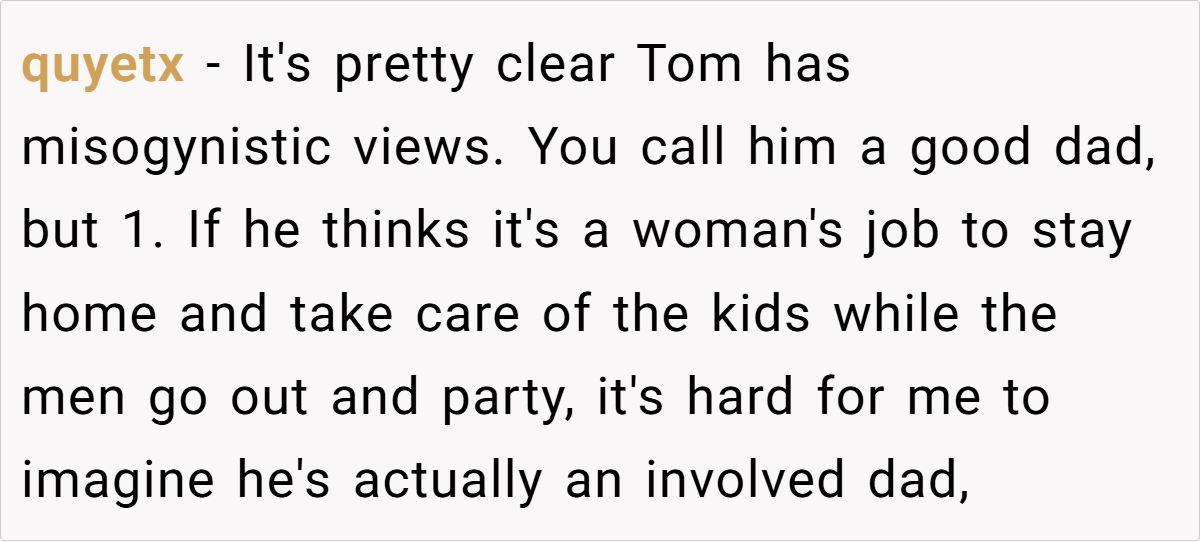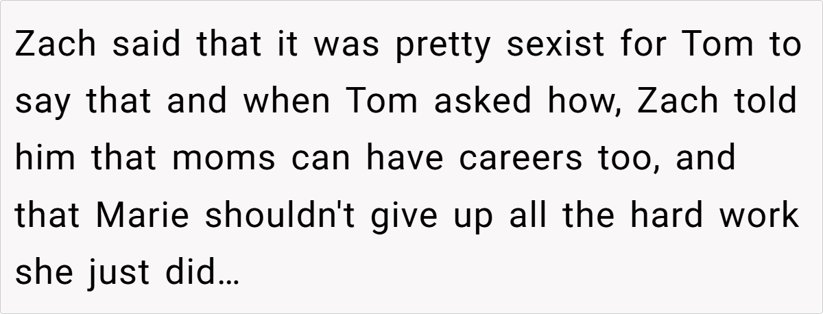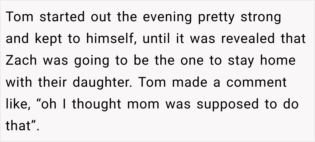 When he made a sexist remark about Zach, Marie’s husband, being a stay-at-home dad, Marie shut him down and asked him to stop. OP, embarrassed, told Tom he is no longer welcome at future family gatherings. Now, she’s wondering if she overreacted.