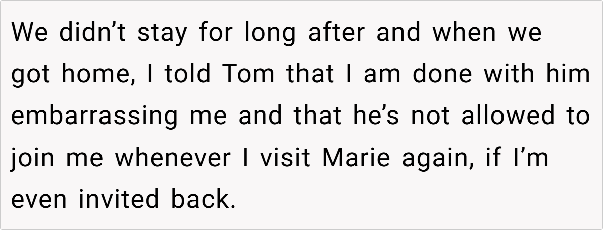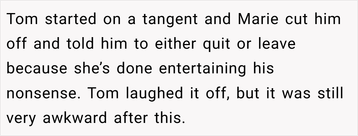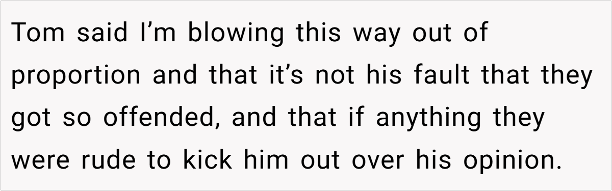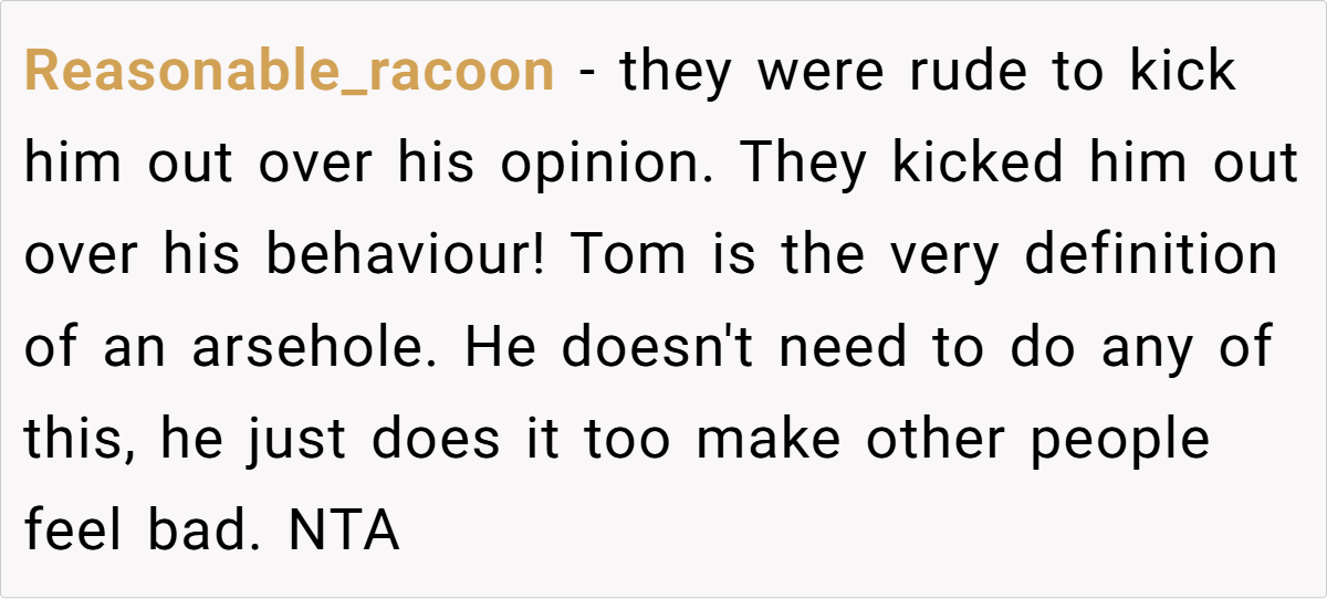 Most Redditors agree—Tom wasn’t kicked out for having an opinion, he was asked to leave because he deliberately stirred up drama. His refusal to respect Marie’s boundaries shows a lack of emotional maturity, and OP calling him out was entirely justified.