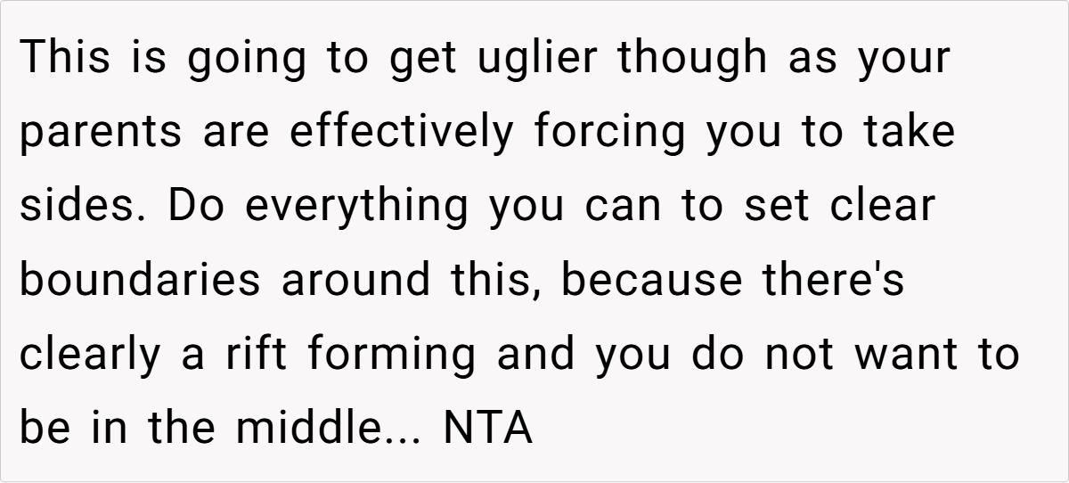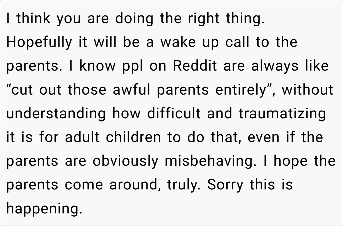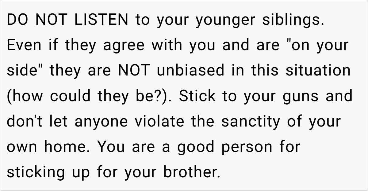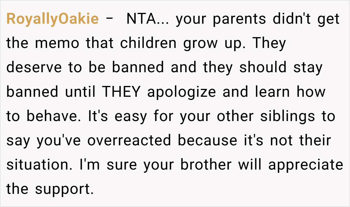 The Reddit community was quick to weigh in on the controversy. As one user remarked, “Your parents didn’t get the memo that children grow up—they need to learn respect.” Others echoed similar sentiments, praising the poster for standing up for her brother while urging her to remain firm in her decision.