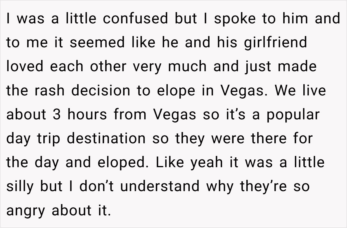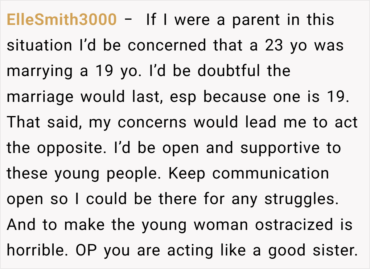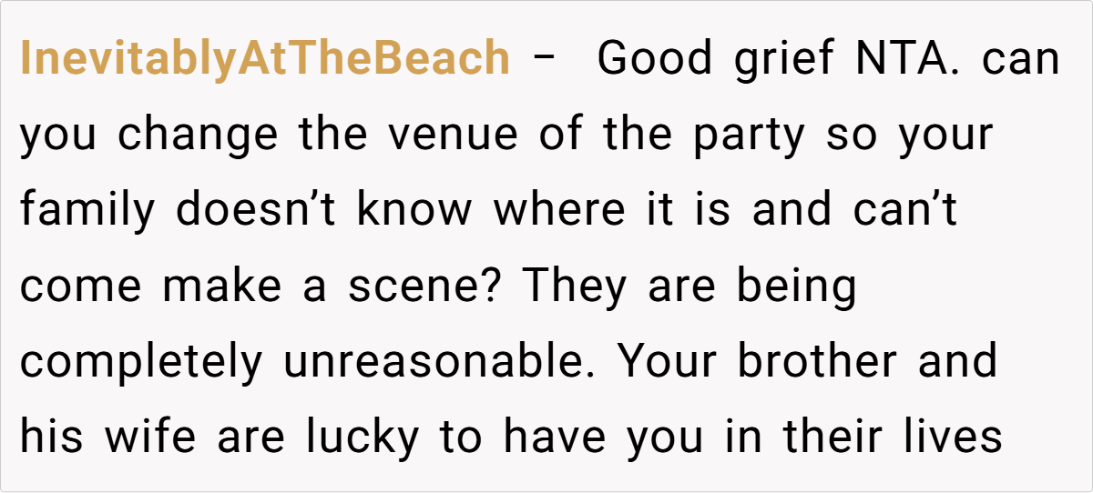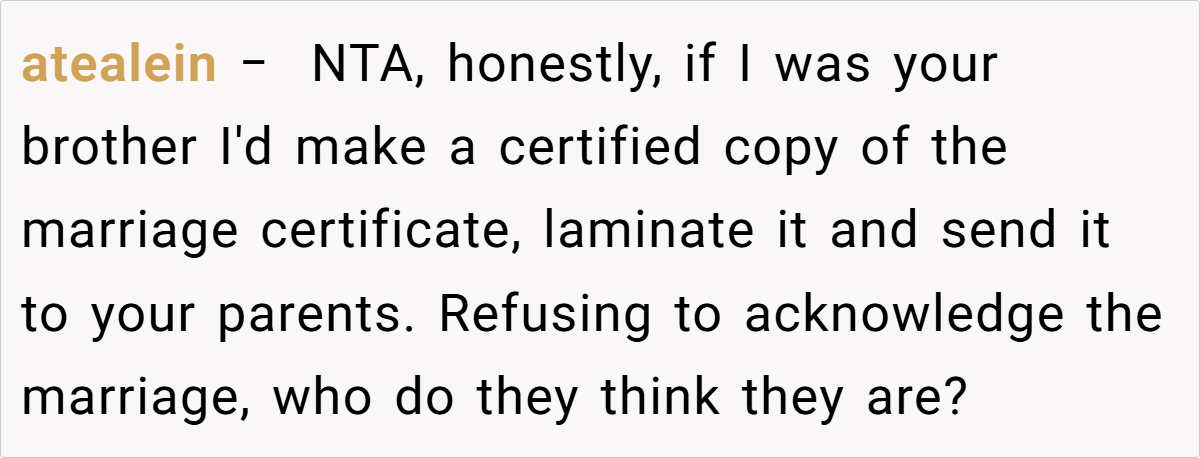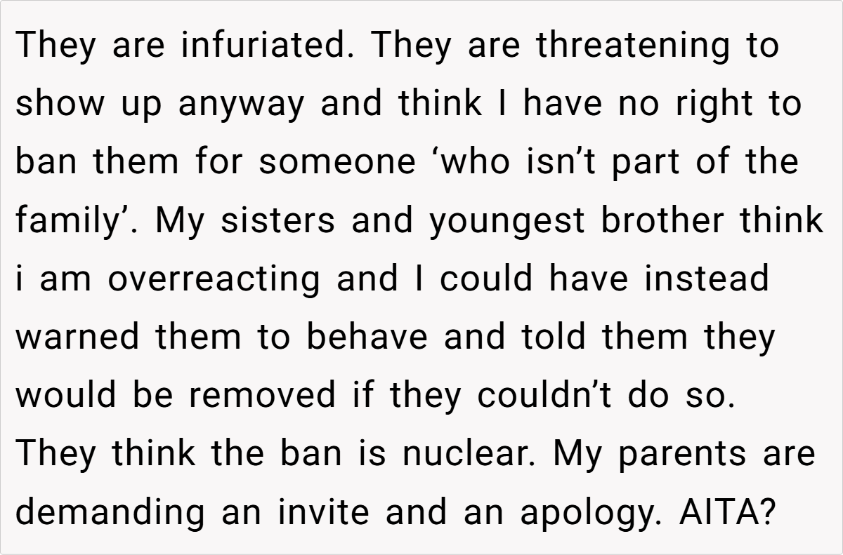 Letting family boundaries be redefined in modern contexts is never an easy task. In this case, the decision to ban parents from a significant family event stems from a longstanding pattern of disrespect toward the new marriage. The poster’s choice reflects a broader struggle between upholding family traditions and embracing the evolving nature of relationships. By choosing to stand up for her brother and his wife, she emphasizes that respect should be extended to all members, regardless of age or past dynamics.