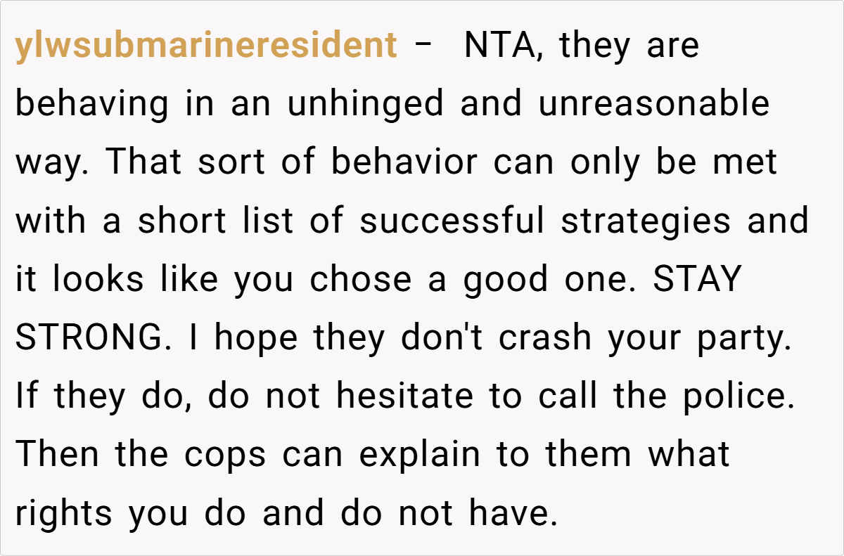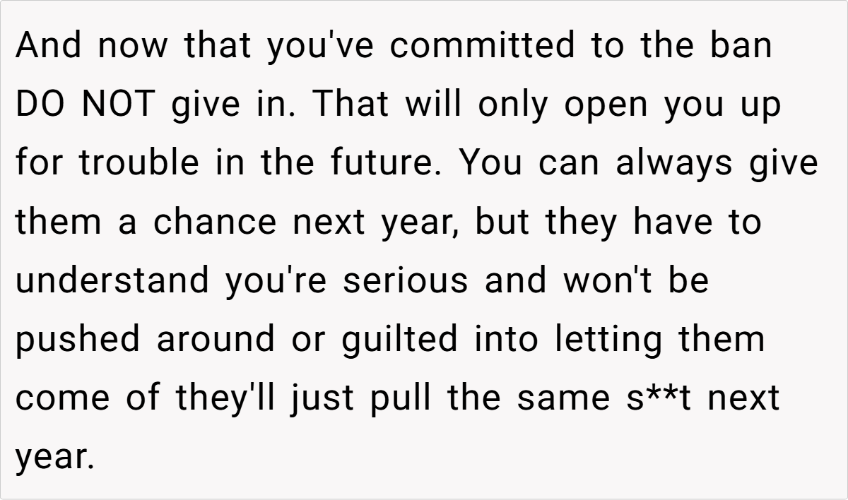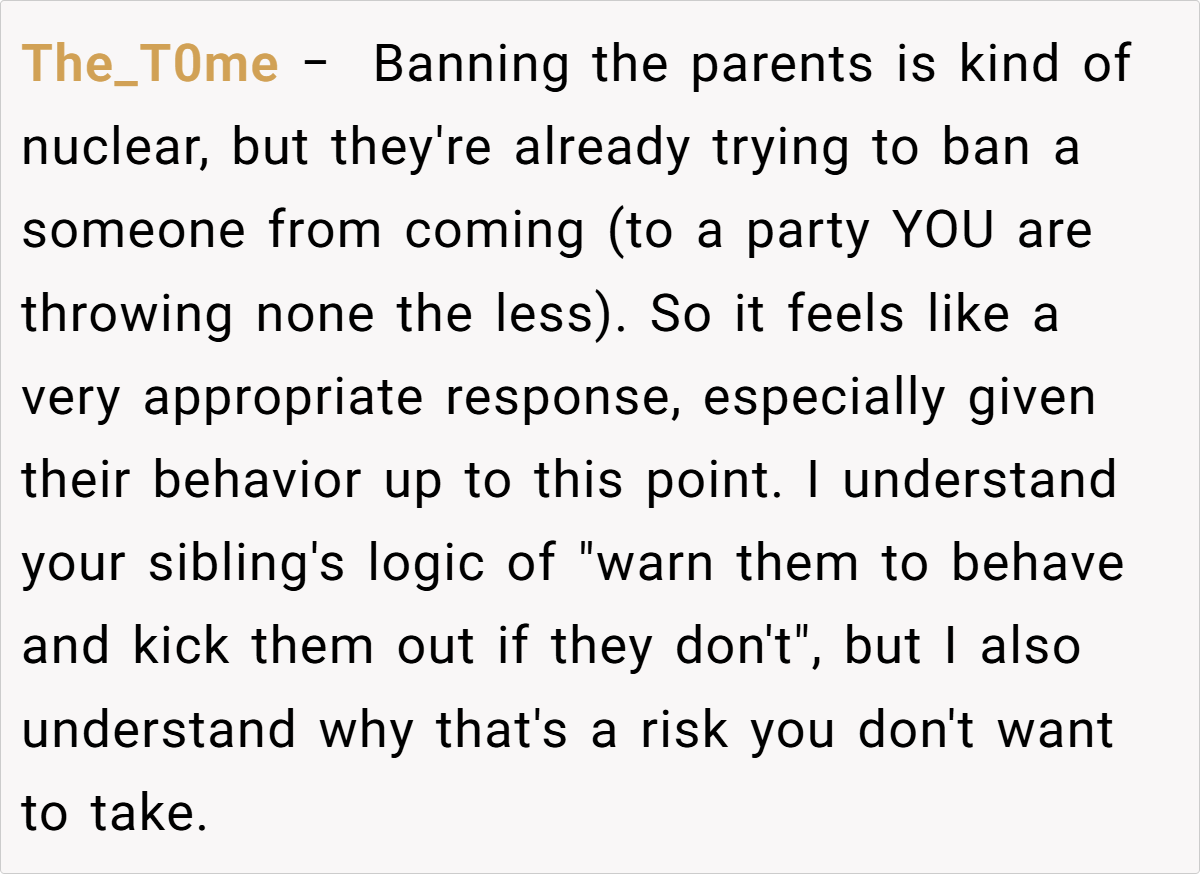 Lastly, it’s worth noting that while some may view the ban as a drastic measure, it represents a necessary recalibration in the face of recurring disrespect. By holding her parents accountable for their behavior, the poster not only protects her brother’s immediate happiness but also sets a precedent for how modern families can navigate contentious issues with dignity and care.