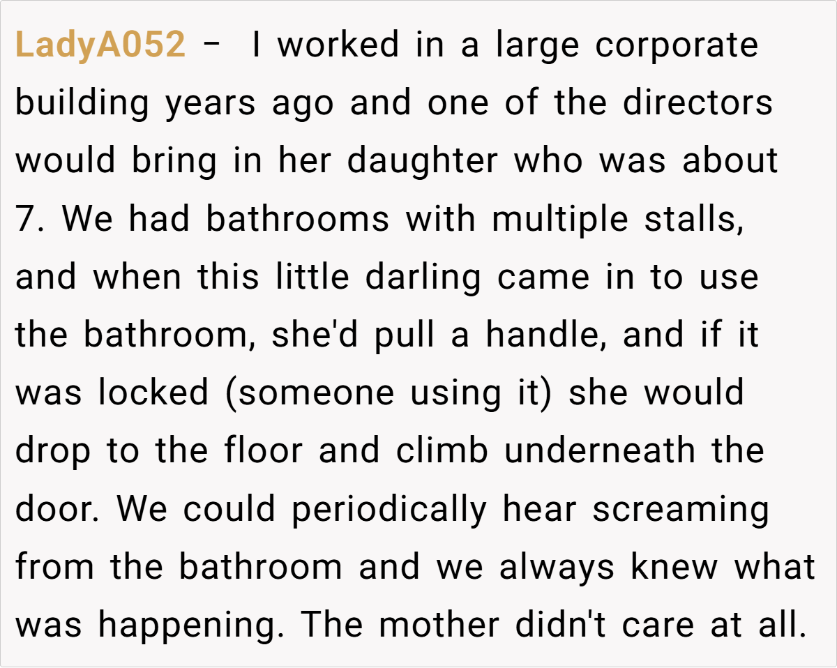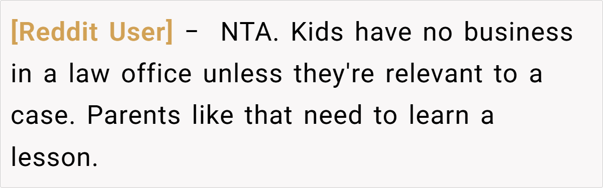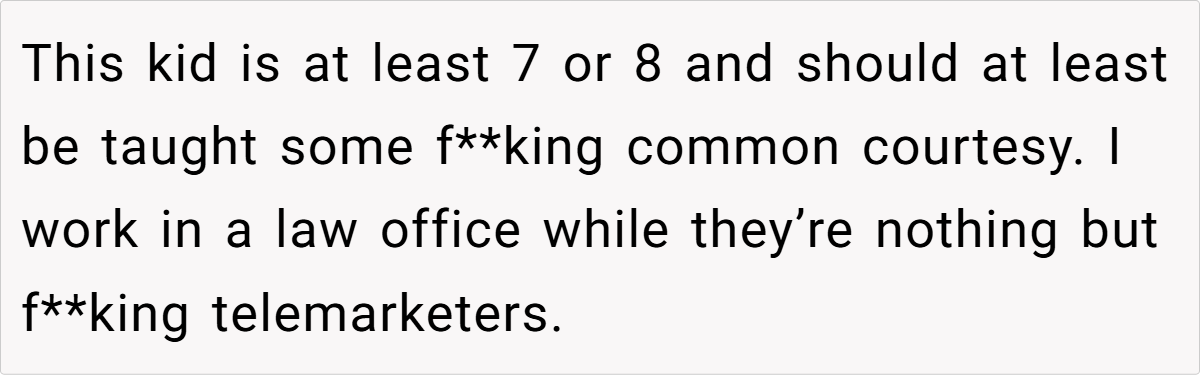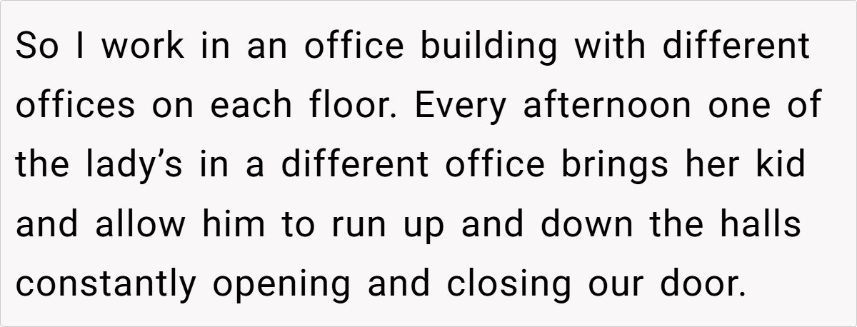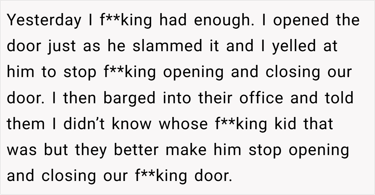 A law office employee’s frustration boiled over when a coworker’s child repeatedly disrupted their workspace by slamming doors. The confrontation—complete with expletives and a classist jab at the parents’ telemarketing jobs—sparked debate about workplace boundaries, parenting, and professionalism.