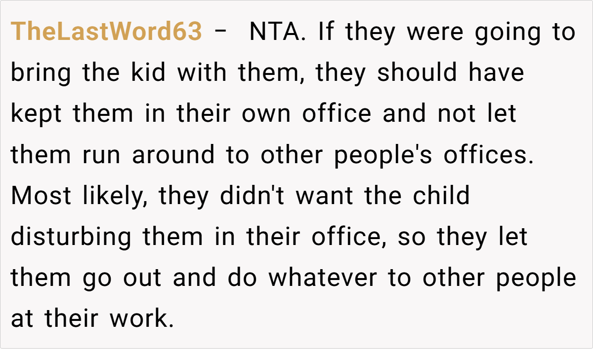 This clash highlights tensions between accommodating working parents and maintaining a distraction-free environment. Is the employee justified in demanding respect for their workspace, or did their explosive reaction cross the line? Read the original story below: