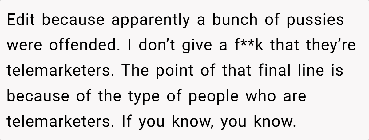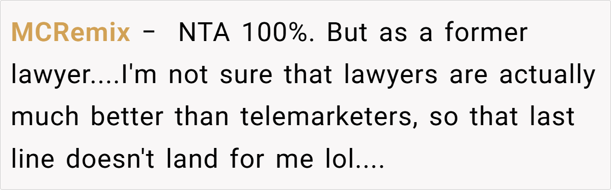The telemarketer jab polarized users: some laughed (“Lawyers vs. telemarketers—pot, meet kettle”), while others noted it revealed elitism (“Your job title doesn’t make you superior”).