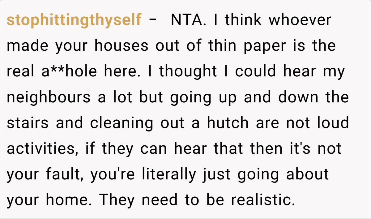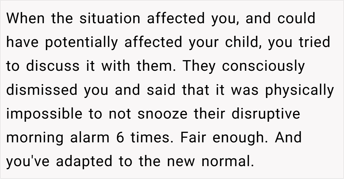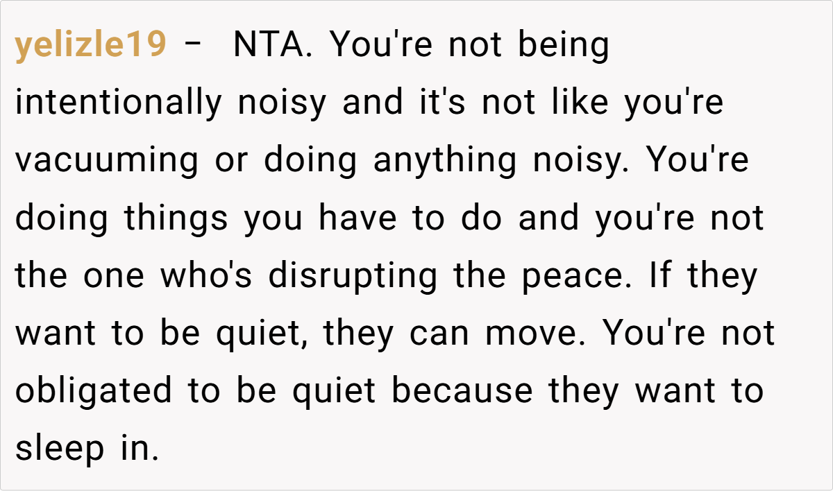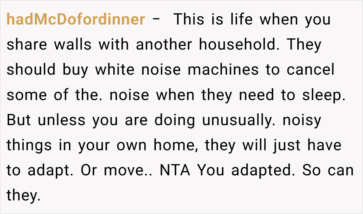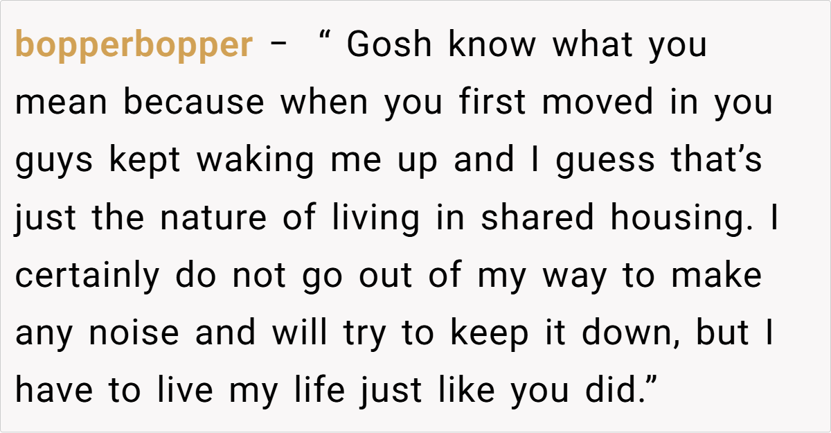 The community comments on Reddit reveal candid and humorous perspectives on shared living. Some users emphasize that adapting and being flexible with personal routines is essential when living in close proximity, while others stress the importance of upholding certain standards to maintain overall quiet. Overall, these remarks encourage mutual understanding and a collaborative search for solutions rather than merely enduring the inconveniences caused by individual habits.