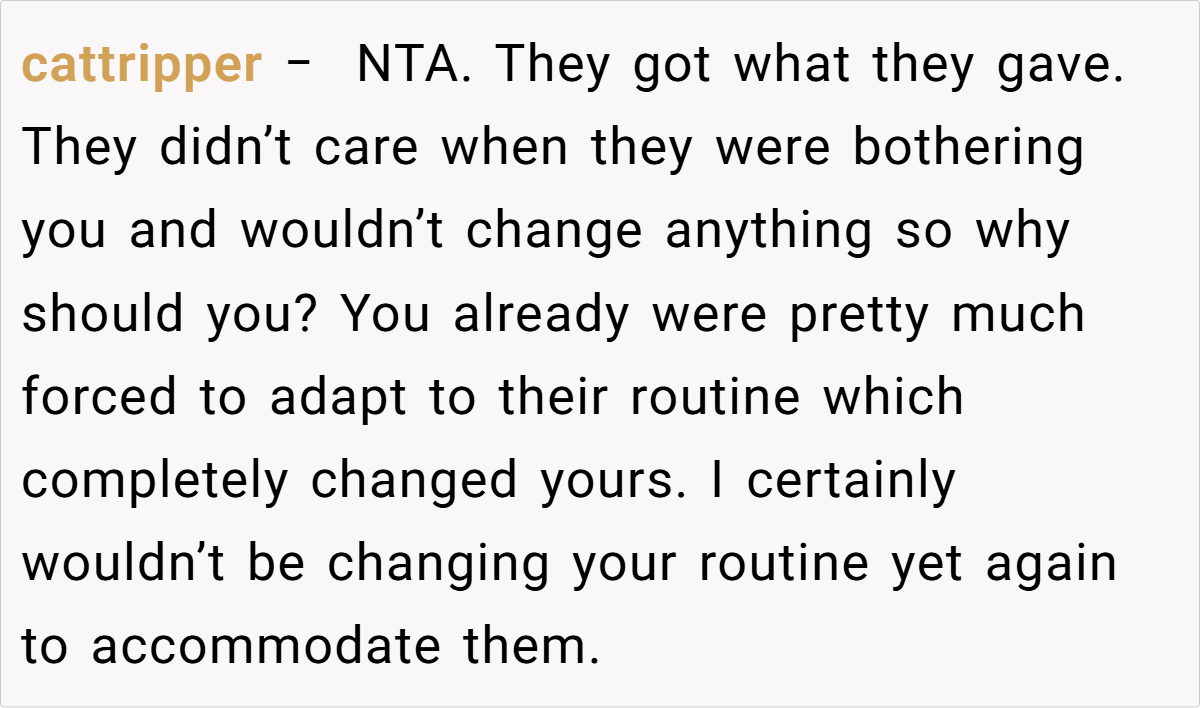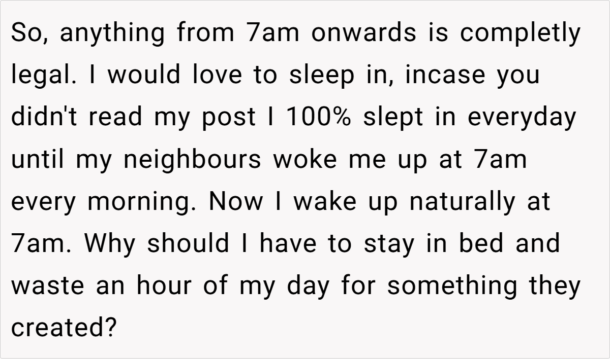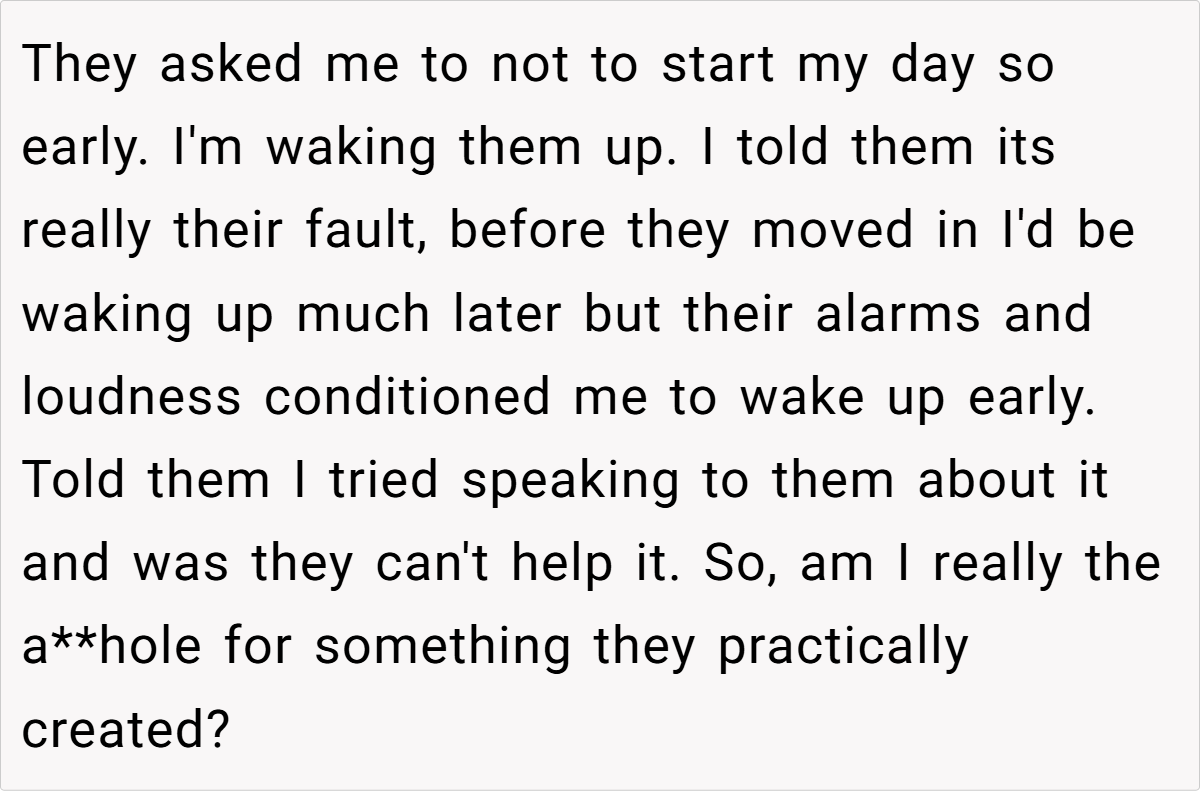 This shift has stirred up a new conflict. My neighbors, who once conditioned my sleeping habits with their own early starts, now claim my early activity disrupts their sleep when they try to catch a few extra minutes. I’m simply following a new routine that I wasn’t responsible for creating in the first place. So, am I the a**hole for being active early in the morning when the situation was practically set in motion by them?