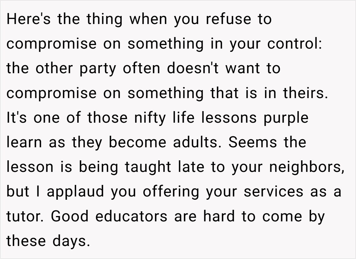 In your case, as a single dad whose sleep schedule was inadvertently shifted by your neighbors’ early morning activities, adapting to an earlier routine is a natural response. Your morning activities—preparing for school, cleaning up, or tending to household tasks—are ordinary tasks, not deliberate disturbances. Dr. Marsh recommends that if the neighbors find the sounds disruptive, they might consider practical solutions like soundproofing or using white noise machines, rather than expecting you to change your routine that was essentially forced upon you.